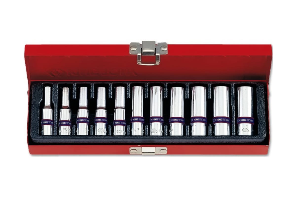 Набор шестигранных глубоких торцевых головок 1/4", 4-13мм, 11шт KING TONY 2511MR состоит из торцевых насадок наиболее распространенных размеров, которые используются для монтажа/демонтажа крепежных элементов при ремонте и обслуживании различных конструкций, механизмов, узлов агрегатов и пр. Изделия выполнены из качественной хром-ванадиевой стали, что делает их устойчивыми к износу и повышает рабочий ресурс. Каждый компонент укомплектован в специальный футляр с крышкой для удобства хранения и транспортировки.