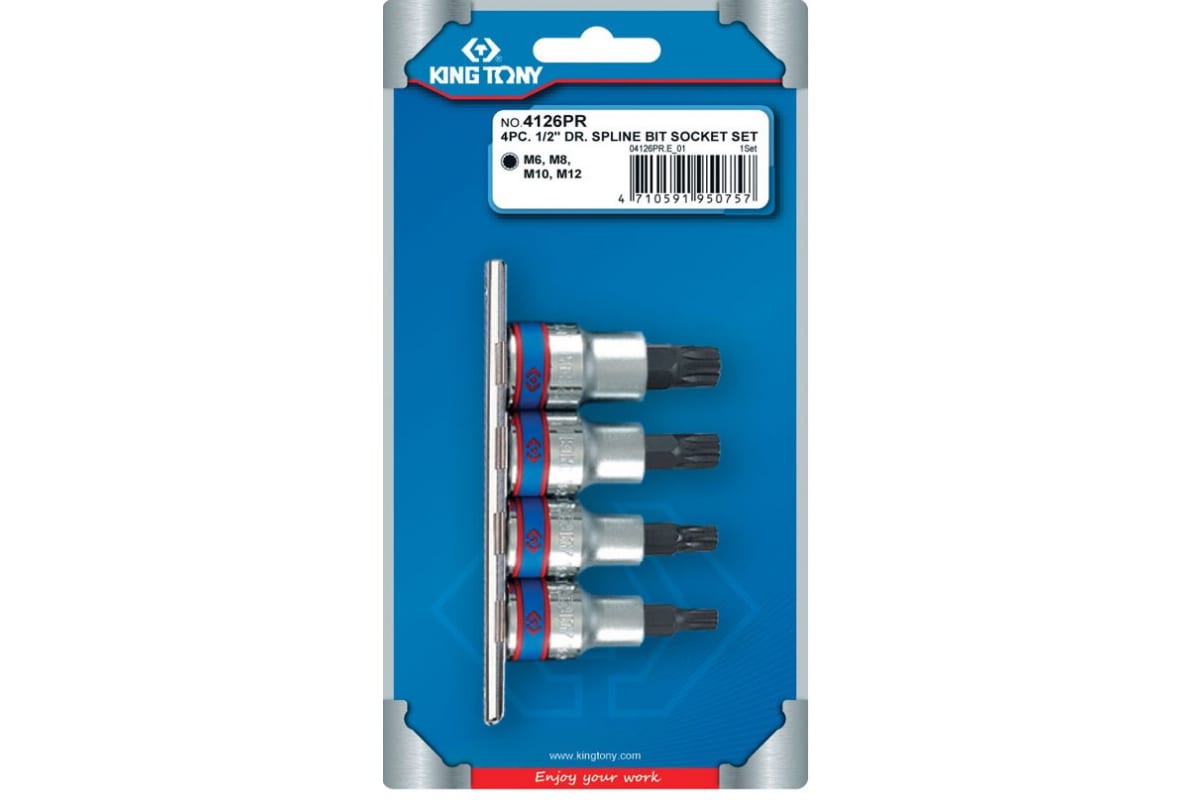 Набор торцевых насадок (1/2", SPLINE, М6-М12, L = 80 мм, 4 предмета) KING TONY 4126PR представляет собой приспособления для установки крепежа. Специальный держатель упрощает хранение оснастки. Длина насадок составляет 80 мм. Вес набора равняется 0.358 кг. Тип наконечника насадок - SPLINE.
