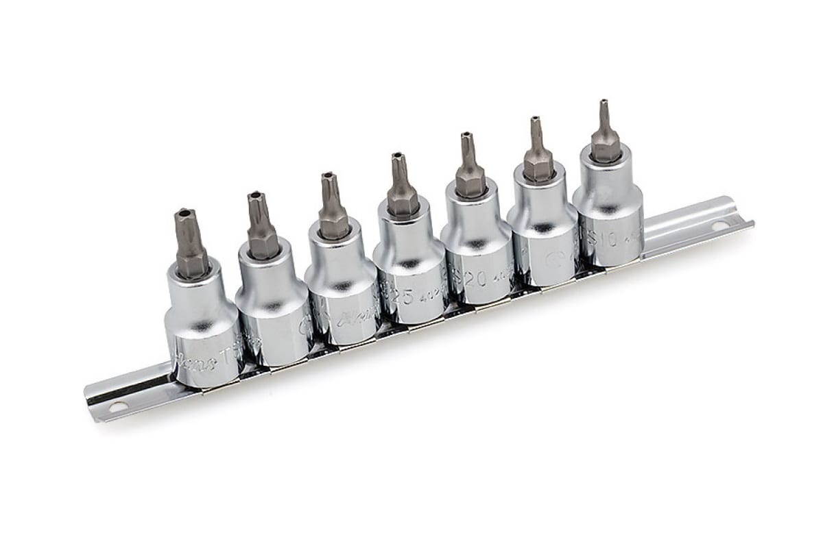 В комплекте 7 головок-бит длиной 55 мм: TS10 , TS15 , TS20 , TS25 , TS27 , TS30 , TS40.