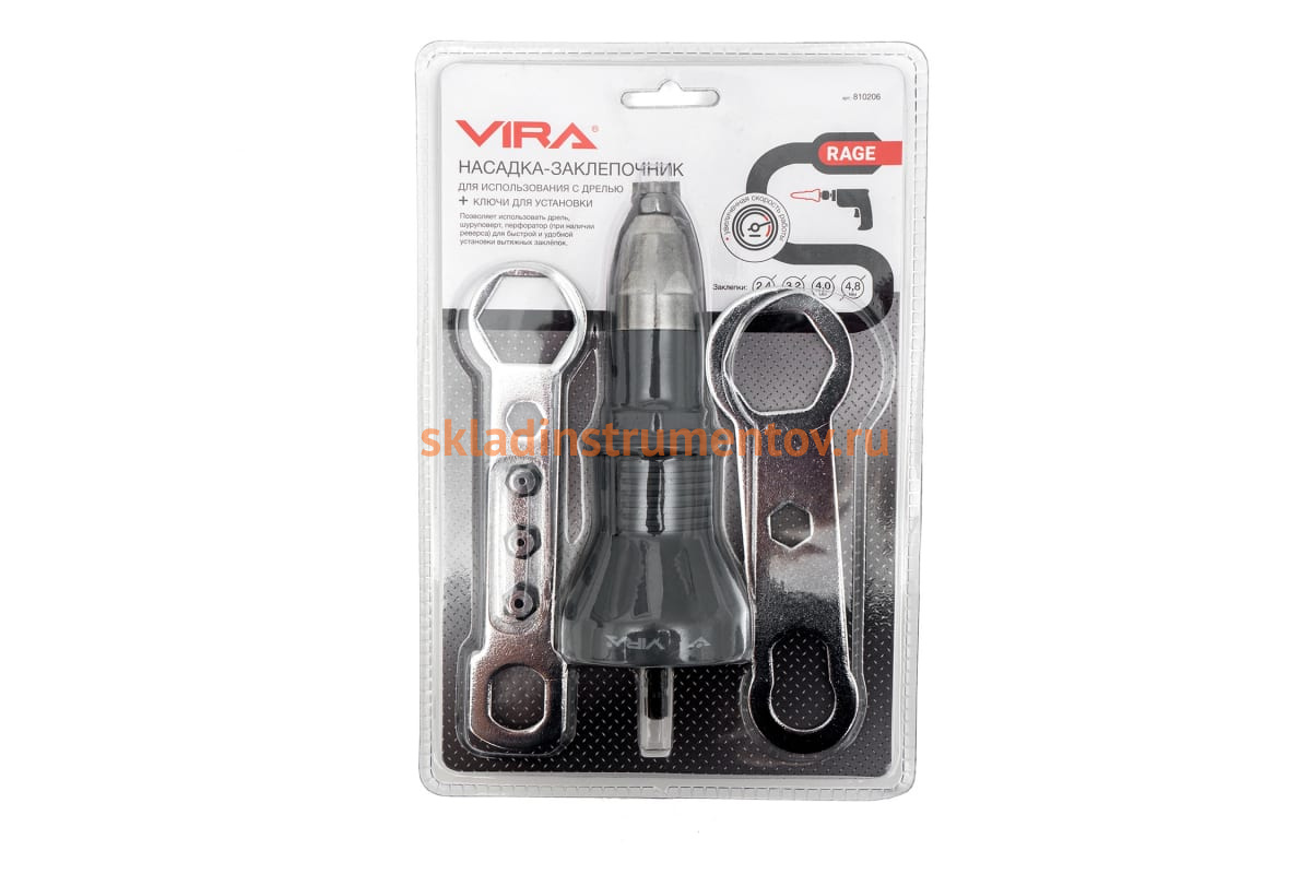Насадка заклепочник VIRA RAGE 810206 позволяет использовать дрель, шуруповерт, перфоратор в качестве заклепочника. Обязательно наличие реверса. Применяется для установки вытяжных заклепок диаметрами 2.4, 3.2, 4.0 и 4.8 мм.