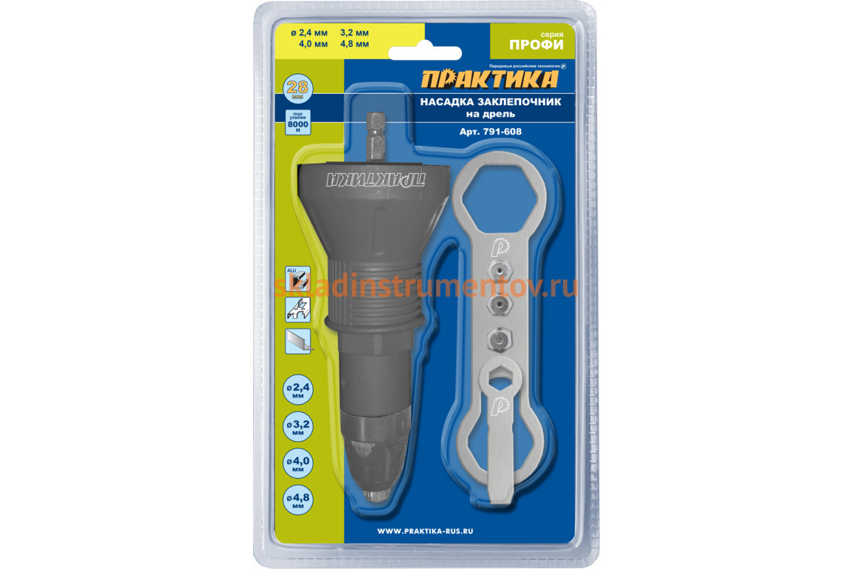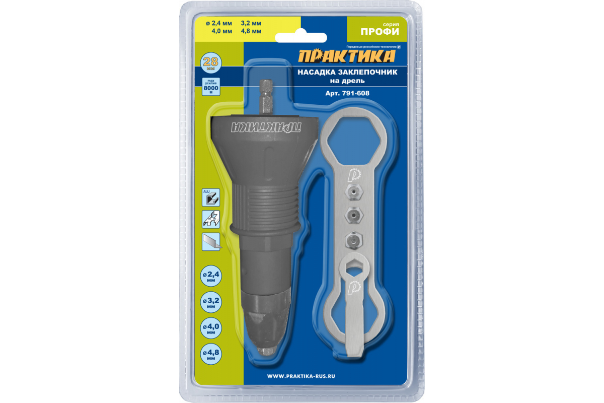 Насадка-заклепочник ПРАКТИКА 791-608 предназначена для шуруповертов и дрелей. Применяется для установки вытяжных заклепок диаметром 2.4-4.8 мм. В комплекте поставляются наконечники следующих размеров: 2.4 мм, 3.2 мм, 4.0 мм, 4.8 мм. Изделие имеет пластиковый корпус.