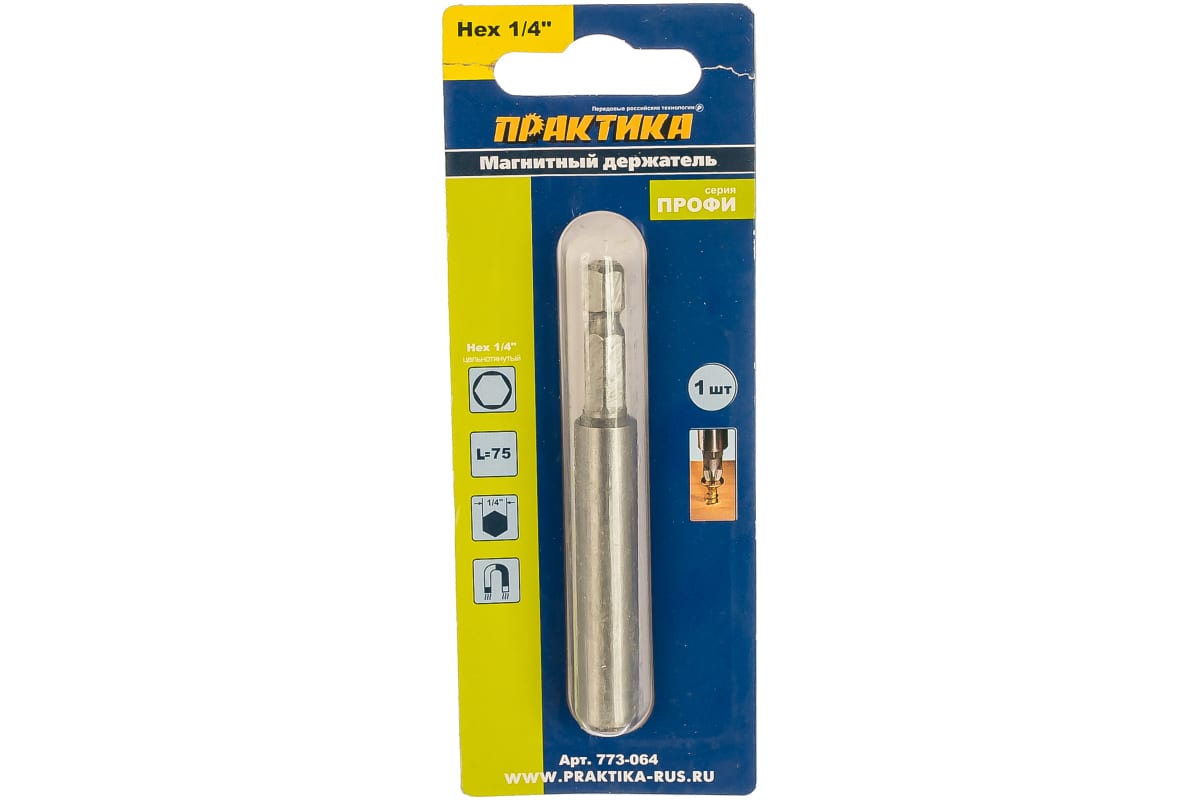 —Держатель магнитный цельнотянутый (75 мм; 1/4) для бит ПРАКТИКА 773-064—
