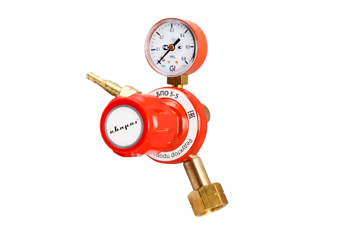 Редуктор пропановый БПО 5-5 Сварог 94141 предназначен для понижения и регулировки давления газа, поступающего из баллона, и автоматического поддержания на необходимом уровне рабочего давления газа.