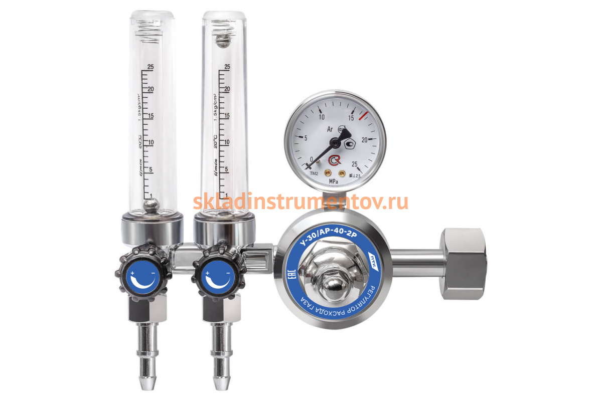 Регулятор расхода газа У-30/АР-40-2Р ПТК 00000029047 предназначен для понижения давления газа, поступающего из баллона, и автоматического поддержания постоянного расхода газа на выходе. Оснастка комплектуется одним манометром и двумя ротаметрами.