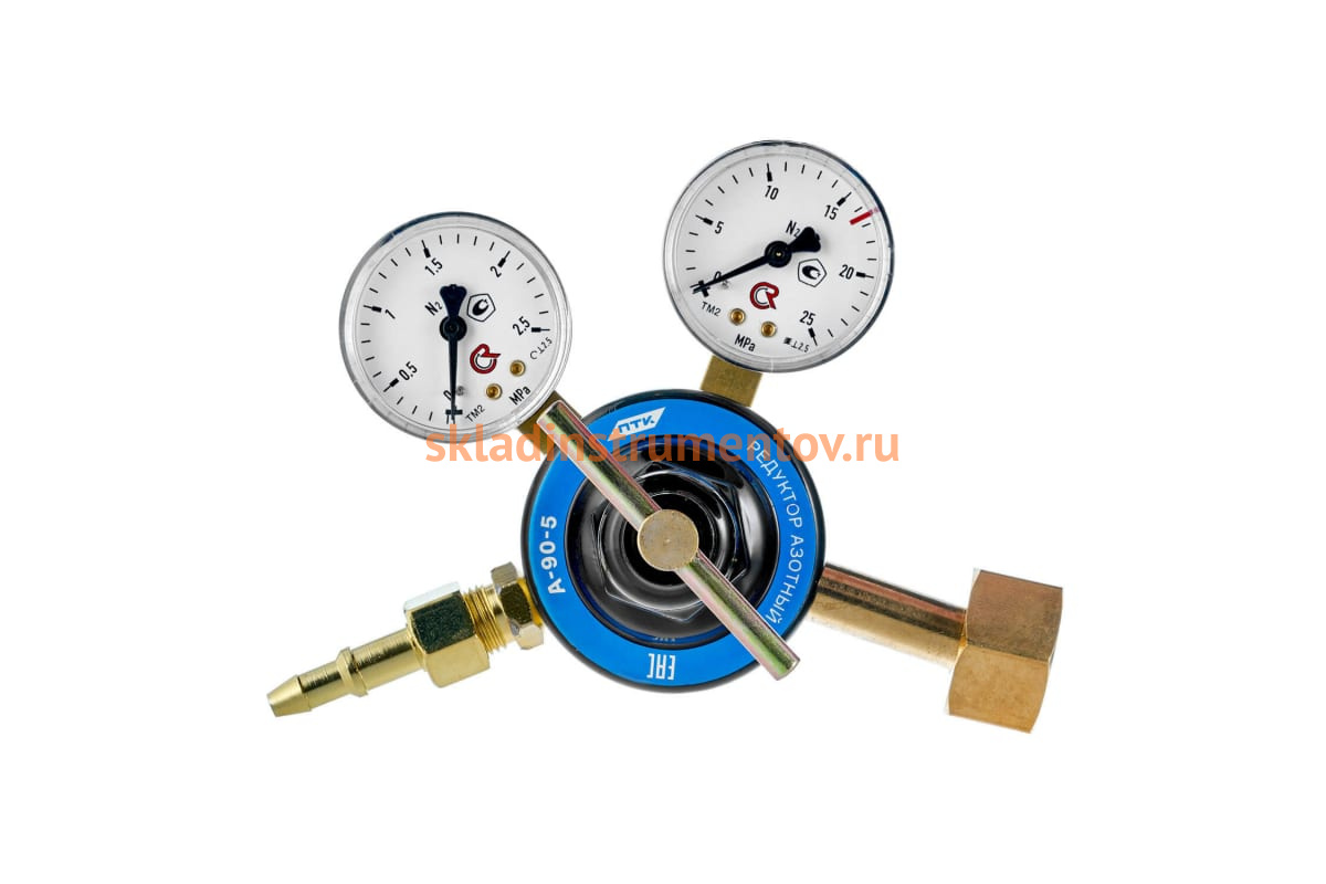 Редуктор азотный А-90-5 ПТК 00000028917 предназначен для понижения давления газа, поступающего из баллона, и автоматического поддержания постоянного расхода газа на выходе. Оснастка комплектуется двумя манометрами.