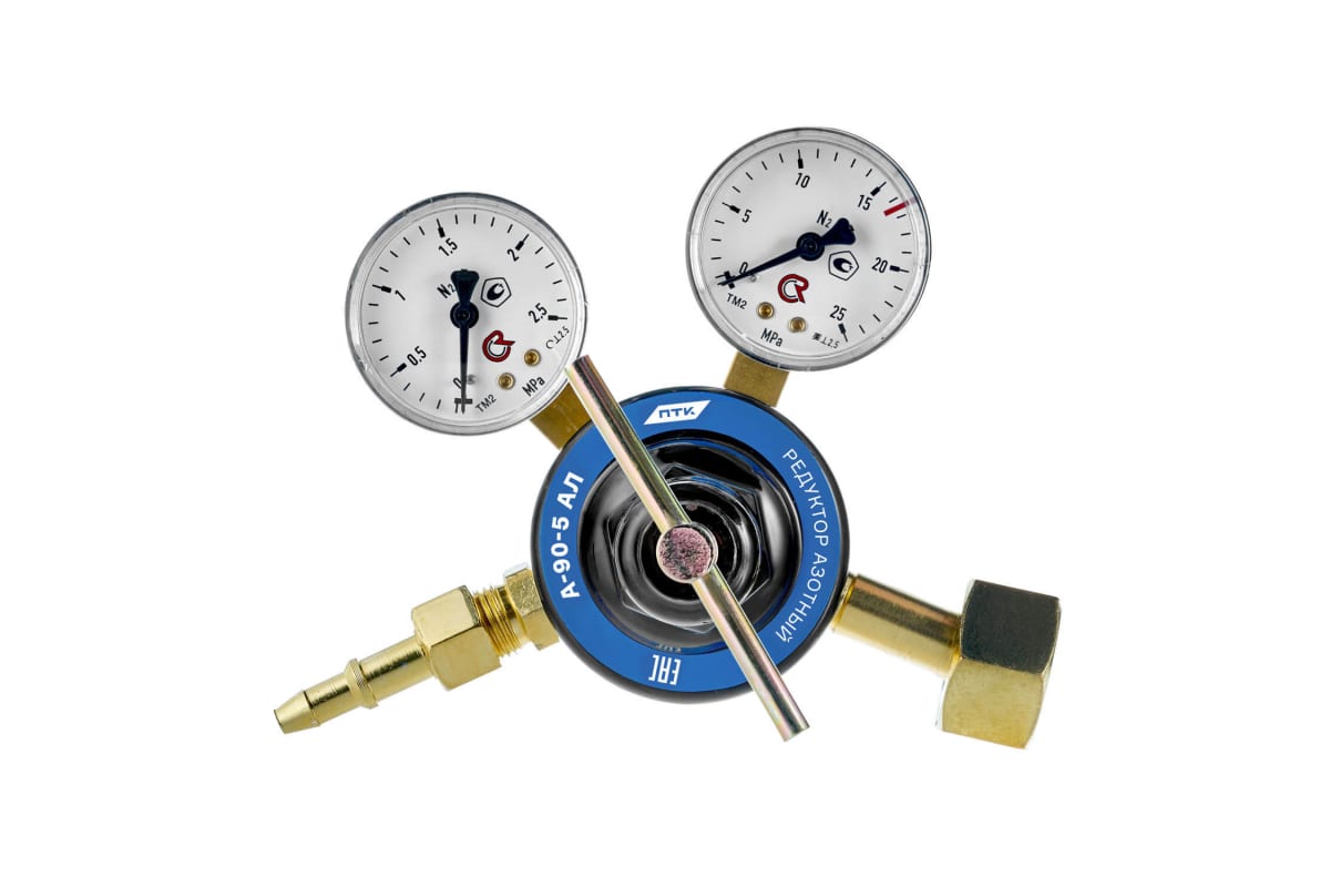 Редуктор азотный А-90-5 АЛ ПТК 00000028920 предназначен для понижения давления газа, поступающего из баллона, и автоматического поддержания постоянного расхода газа на выходе. Оснастка комплектуется двумя манометрами.
