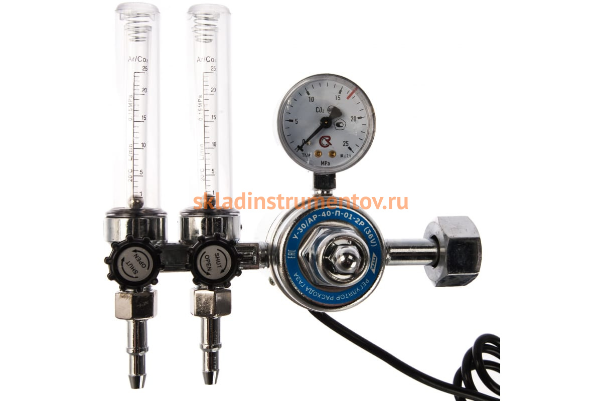Регулятор расхода газа У-30/АР-40-П-01-2Р 36V ПТК 00000029056 предназначен для понижения и регулирования давления аргона или углекислого газа, поступающих из баллона, и автоматического поддерживания постоянного рабочего расхода газа на выходе. Корпус изготовлен из алюминия методом литья под давлением, колбы ротаметров изготовлены из прочного пластика.