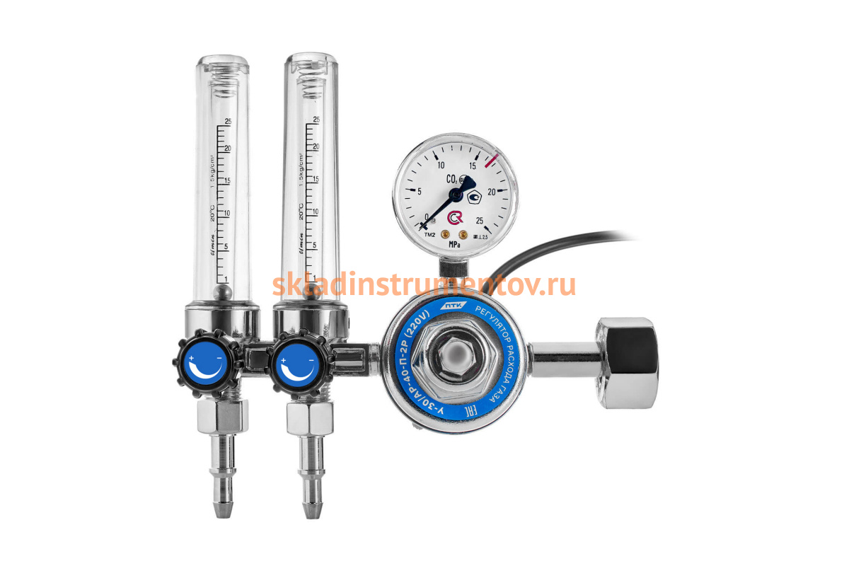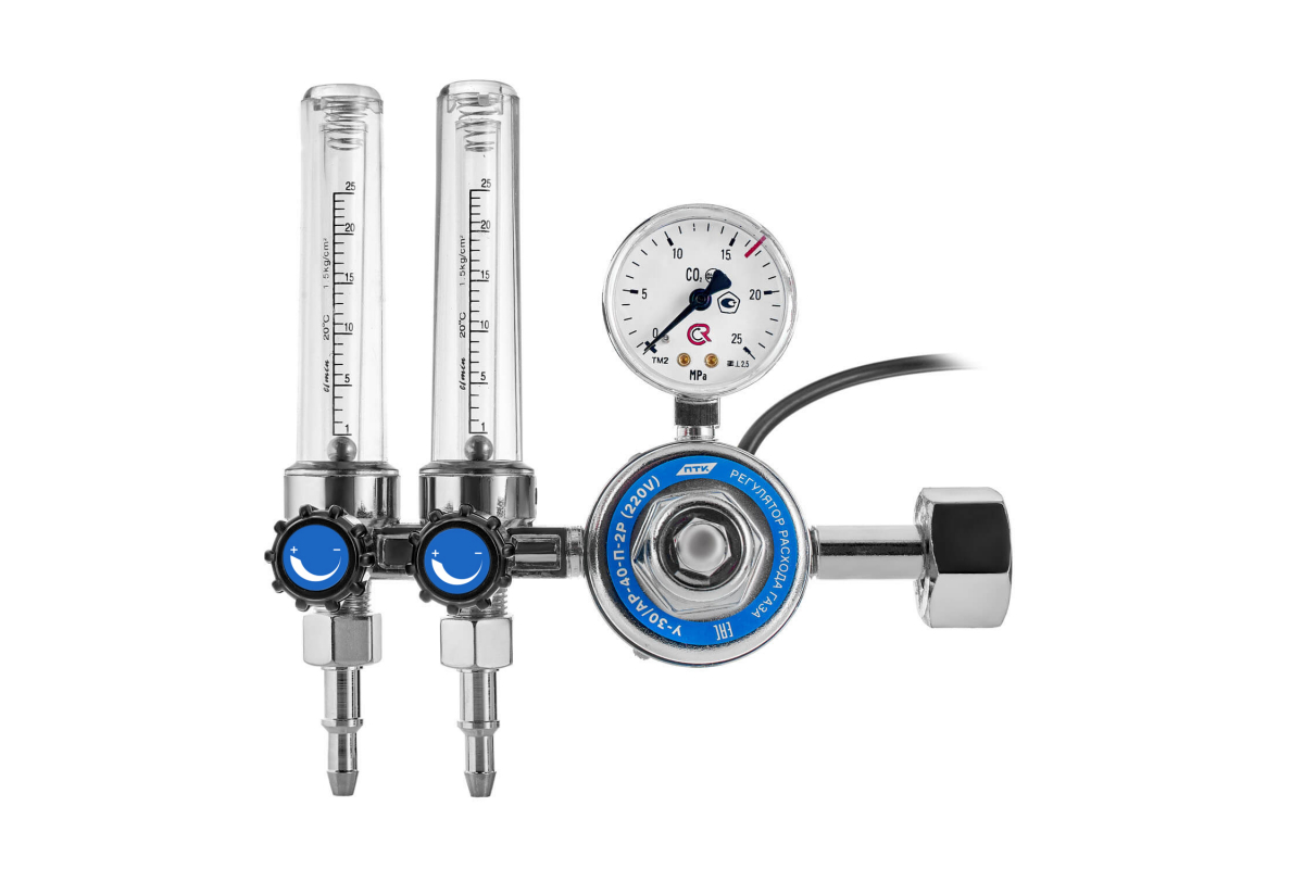 Регулятор расхода газа У-30/АР-40-П-2Р 220 В ПТК 00000029051 предназначен для понижения и регулирования давления аргона или углекислого газа, поступающих из баллона, и автоматического поддерживания постоянного рабочего расхода газа на выходе. Корпус регулятора изготовлен из латуни, корпус спаренных ротаметров изготовлен из силумина - сплава алюминия с кремнием.