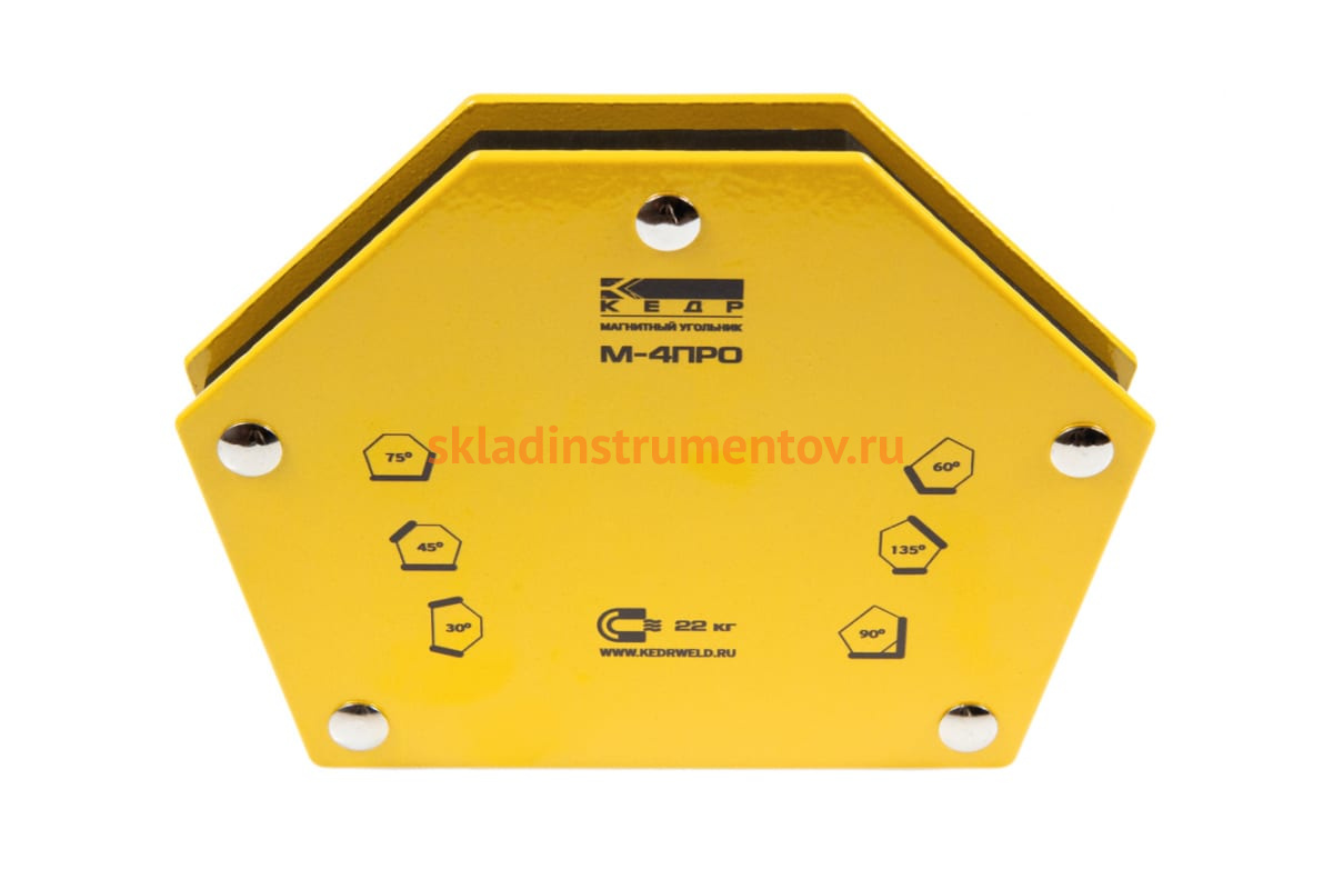 Магнитный угольник М-4 ПРО Кедр 8005171 предназначен для фиксации металлических деталей при сварке, пайке, сборке конструкций. Применяется для работы с круглыми трубами, прямоугольными трубами, полосами, уголками, профилями, листовым, сплошным и другими видами металла. Угольник быстро и надёжно соединяет детали, сокращает время работы, облегчает монтаж и заменяет громоздкие зажимы и струбцины. Углы: 30°, 45°, 60°, 75°, 90°, 135°. Максимальное усилие — 22 кг.