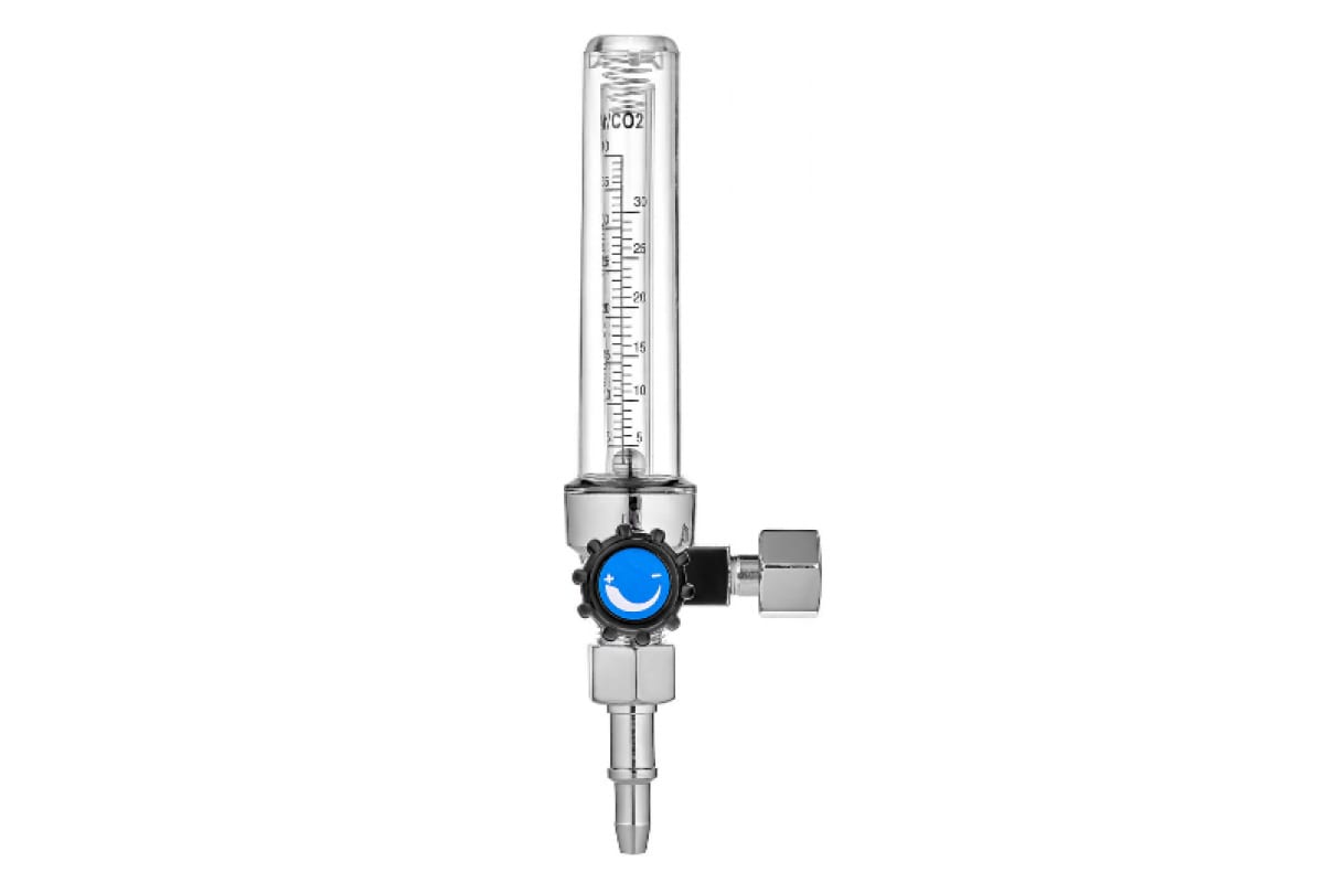 Сделан из силумина, а колба ротаметра из прочного пластика. Внутри колбы расположена стеклянная трубка для шарика-поплавка. На трубку нанесена двойная шкала расхода газов Ar/CO2, которая показывает расход каждого из них (л/мин).