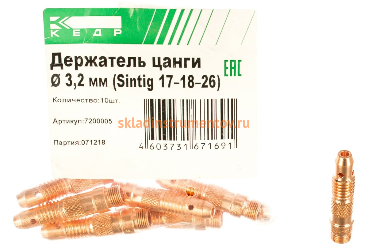 Держатель цанги КЕДР 7200005 предназначен для горелок Sintig 17–18–26. Применяется для установки и надежной фиксации цанги в сопле горелки. Отверстия на держателе предназначены для равномерного распределения защитного газа в сопле, тем самым держатель также выполняет функции диффузора во время TIG-сварки.