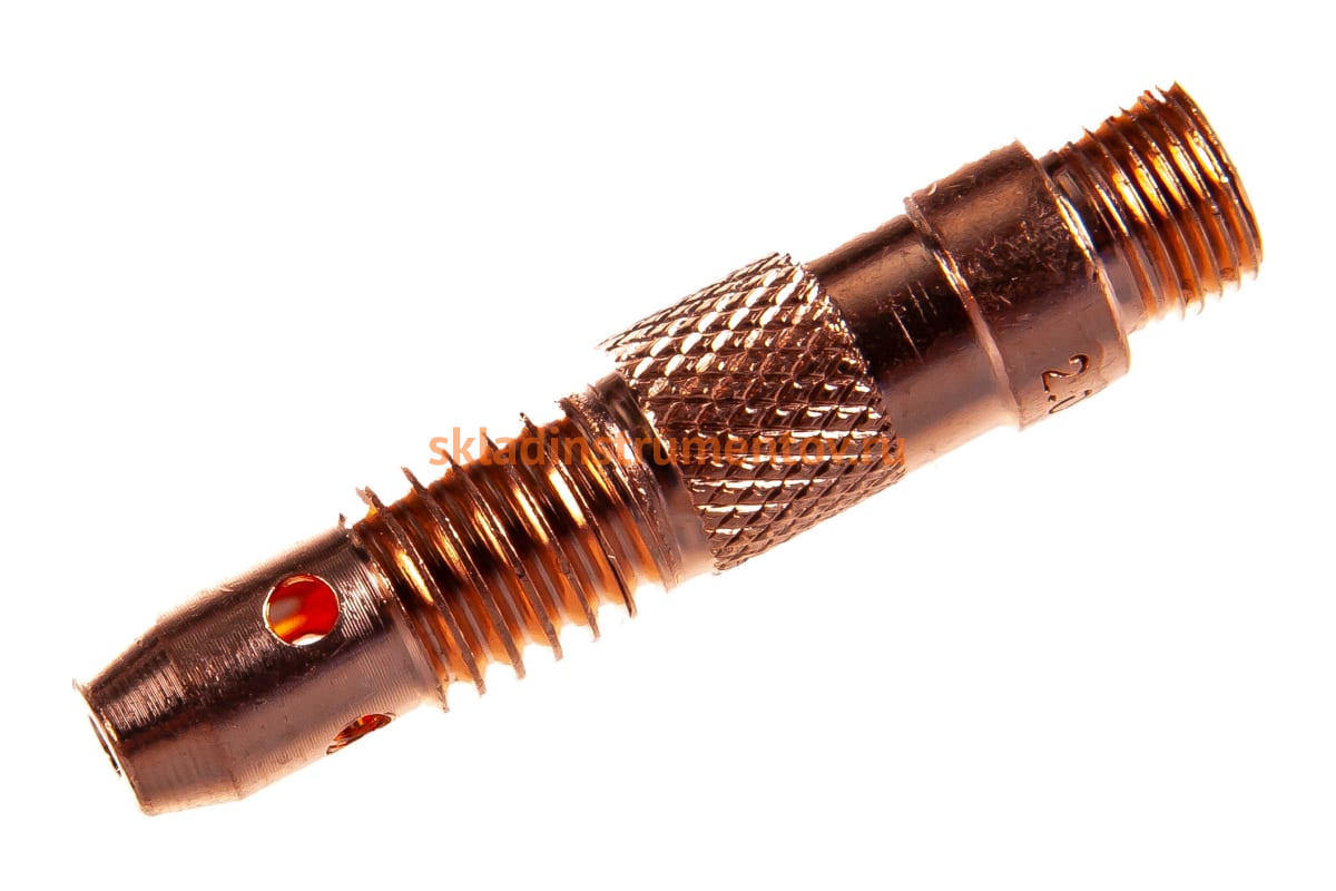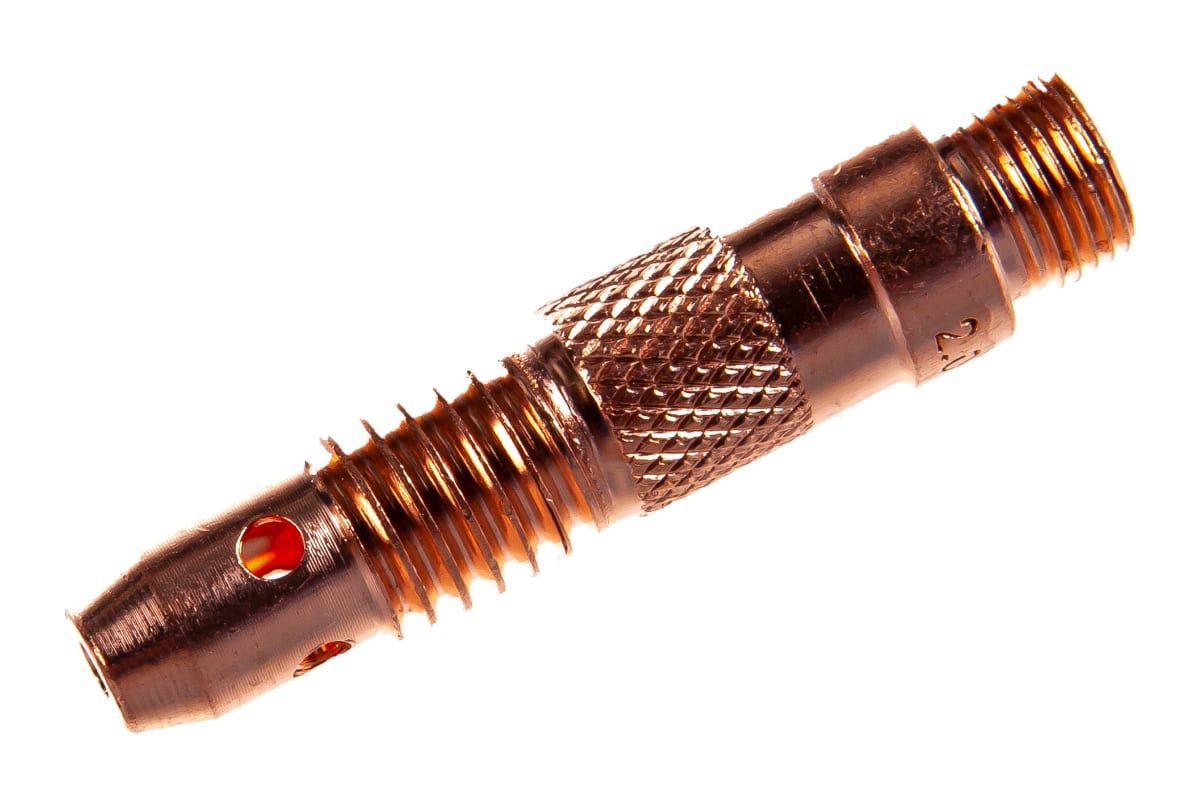 Держатель цанги КЕДР 8001439 предназначен для горелок Sintig 17–18–26. Применяется для установки и надежной фиксации цанги в сопле горелки. Отверстия на держателе предназначены для равномерного распределения защитного газа в сопле, тем самым держатель также выполняет функции диффузора во время TIG-сварки.