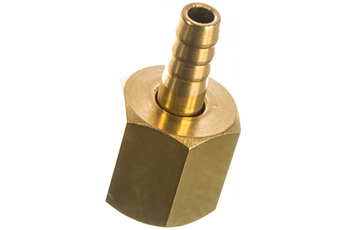 Штуцер DEN1005 ПТК 00000027295 предназначен для подключения шланга к горелке. Состоит из накидной гайки с внутренней резьбой М10x1 и штуцера елочка диаметром 5 мм.