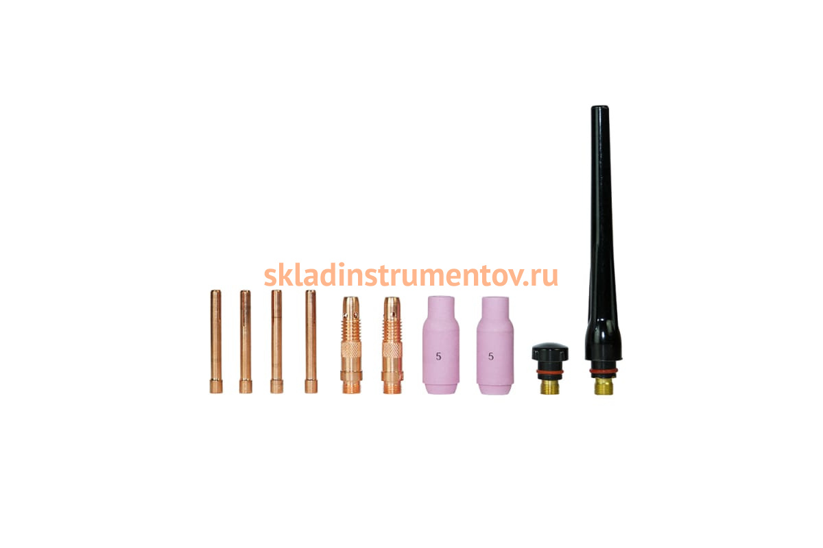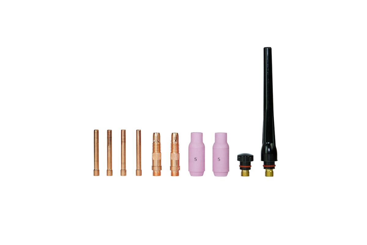 Набор состоит из 10 предметов, каждый из которых необходим при сварочных работах. Керамическое сопло обеспечивает надежную подачу газа в зону сварки. Цанги, разные по размеру, обеспечат надежную фиксацию шпильки в пистолете сварочного аппарата. Держатель создает дополнительный хват расходных материалов, применяемых при сварке.