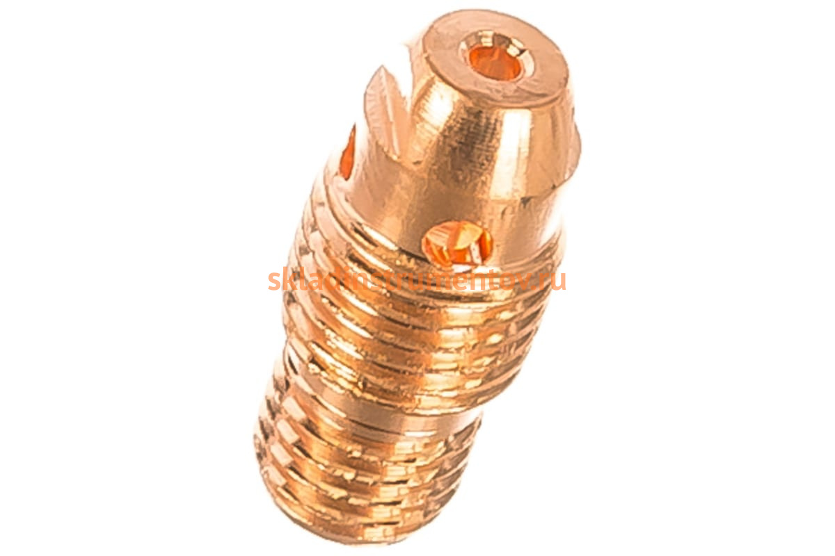 Держатель цанги IGF0008-16 Сварог 00000087336 предназначен для горелок TS 9-20-25. Применяется для установки и надежной фиксации цанги в сопле горелки. Отверстия на держателе предназначены для равномерного распределения защитного газа в сопле, тем самым держатель также выполняет функции диффузора во время TIG-сварки.