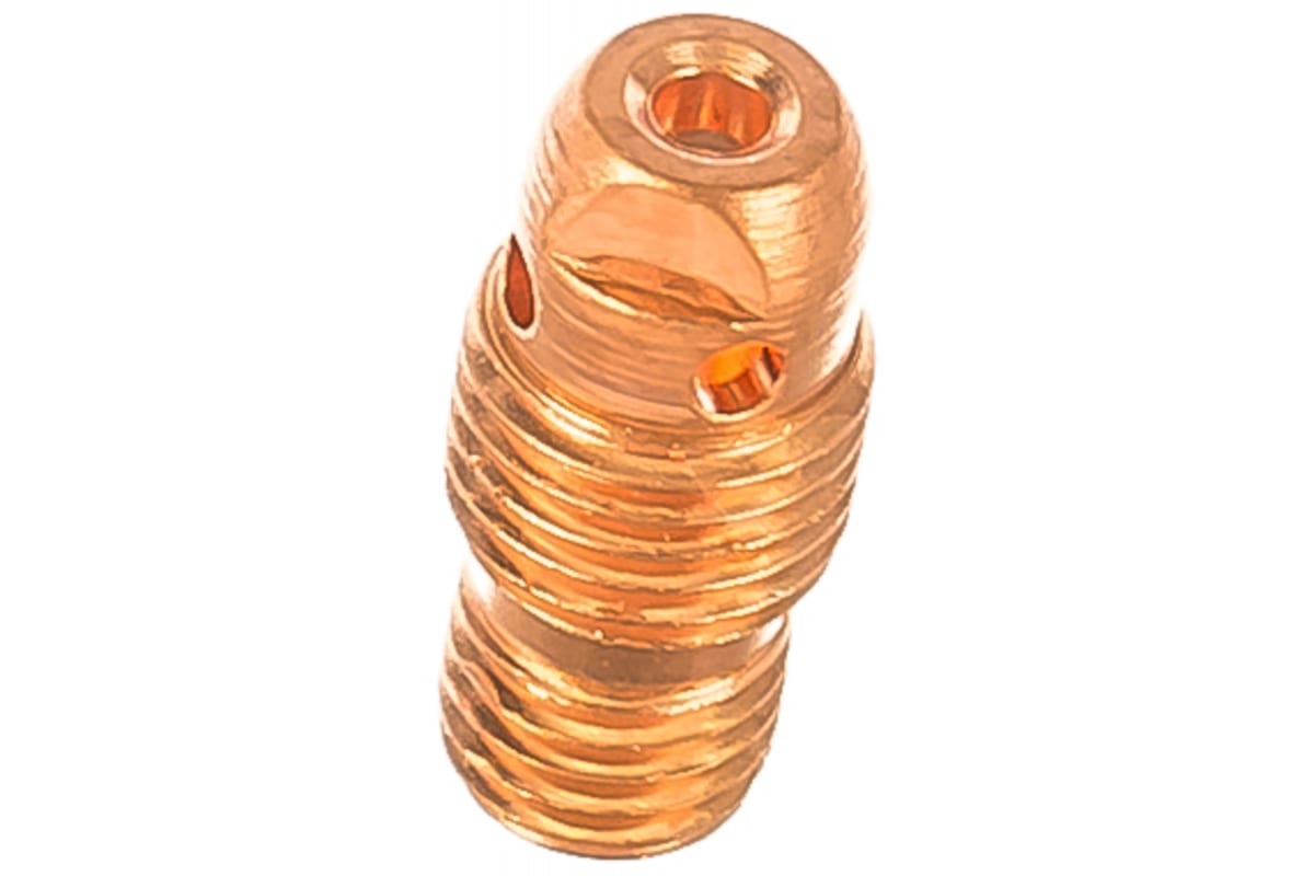 Держатель цанги IGF0008-22 Сварог 00000087338 предназначен для горелок TS 9-20-25. Применяется для установки и надежной фиксации цанги в сопле горелки. Отверстия на держателе предназначены для равномерного распределения защитного газа в сопле, тем самым держатель также выполняет функции диффузора во время TIG-сварки.