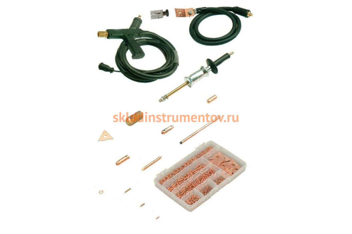 Набор для кузовного ремонта Blue Weld 802604 состоит из кабеля с пистолетом, клеммы с проводом, набора контактных наконечников, оправки для специальных шайб, электродов для гвоздей, угольных электродов, шайбы, штифтов и прочего. При покупке данного набора появляется возможность использовать приспособления для вытяжки.