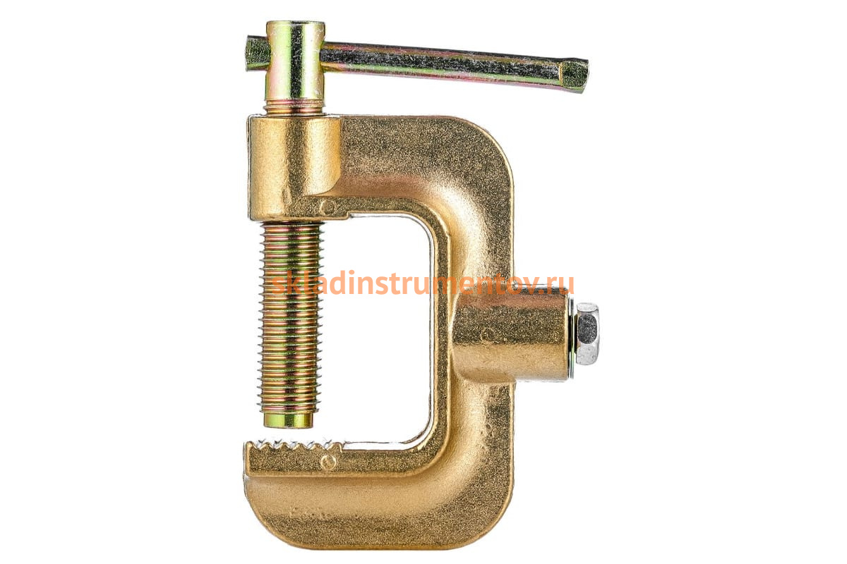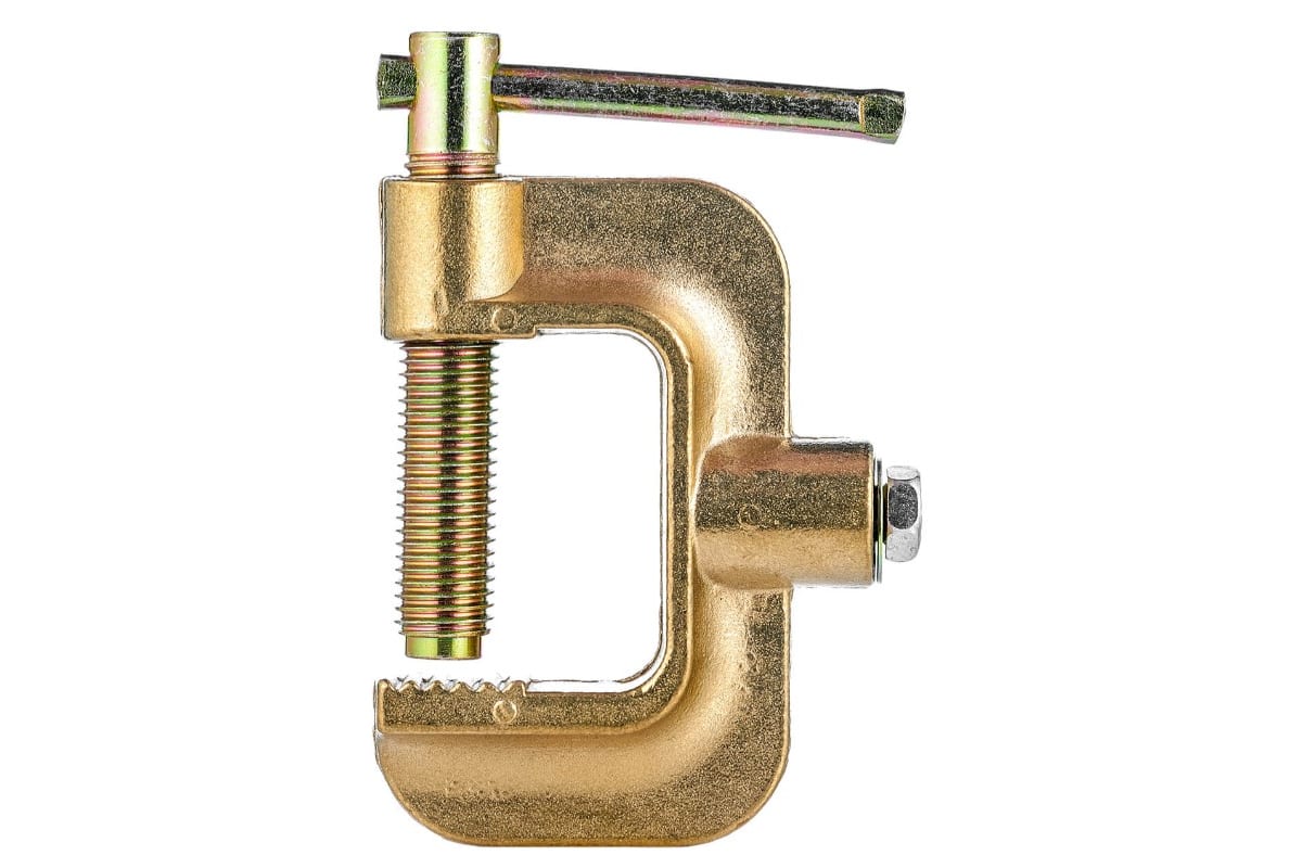 Клемма заземления КЗ-66 струбцина ПТК 00000035164 состоит из G-образного основания с креплением под кабель и винтового контактного упора с резьбой 13 мм. Ширина губок составляет 26 мм. Рекомендуемое сечение кабеля, мм²: 70-95.