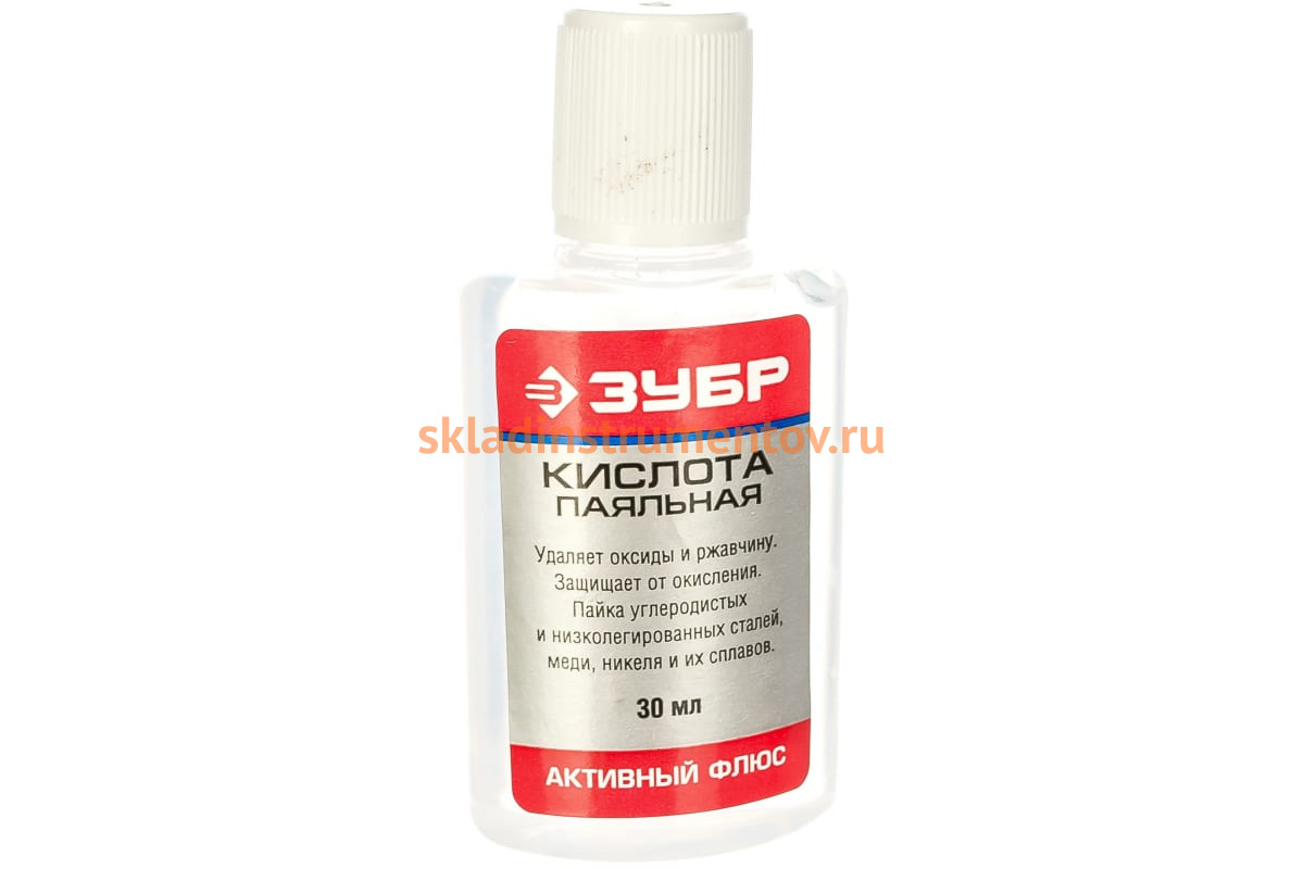 Кислота Зубр 55491-030 применяется для пайки углеродистых и низколегированных сталей, меди, никеля и сплавов. Необходима отмывка 5% раствором кальцинированной соды.