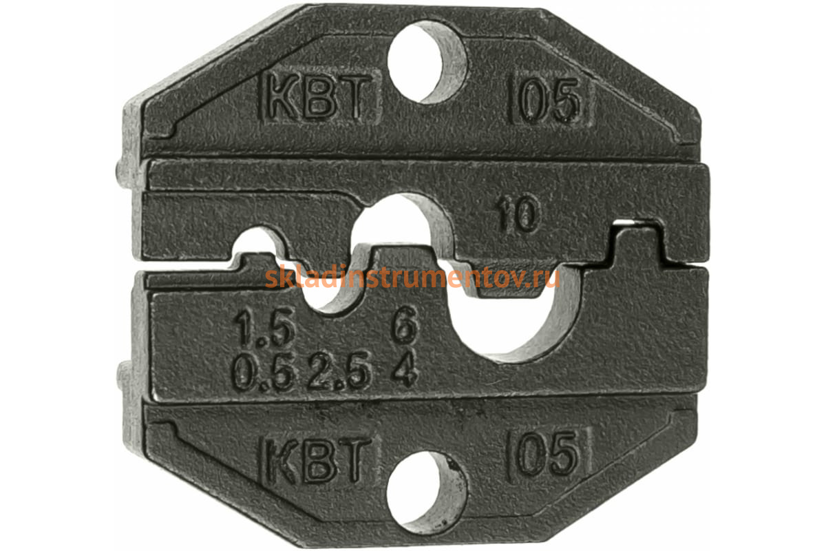 Матрица МПК-05 КВТ 69961 используется совместно с пресс-клещами СТВ-05, СТК-05, набором СТВ. Применяется для опрессовки неизолированных медных наконечников и гильз. Типы наконечников: ТМЛ, ТМЛс, ТМ, ГМЛ, ГМЛ(о), наборы СОТК. Сечения проводов: 0.25/0.34/0.5/0.75/1.0/1.5/2.5/4/6/10 мм². Тип матрицы — четырехпозиционная. Профиль обжима — клиновидный.