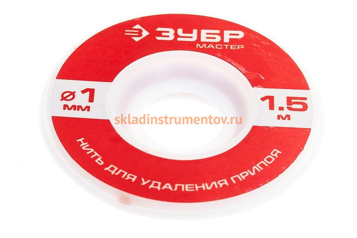 Нить МАСТЕР Зубр 55469-1 применяется для удаления излишков припоя в местах пайки контактов, радиодеталей и проводников. Представляет собой оплётку из тонкой медной проволоки, покрытую специальным флюсом. Длина — 1.5 м. Диаметр — 1 мм.