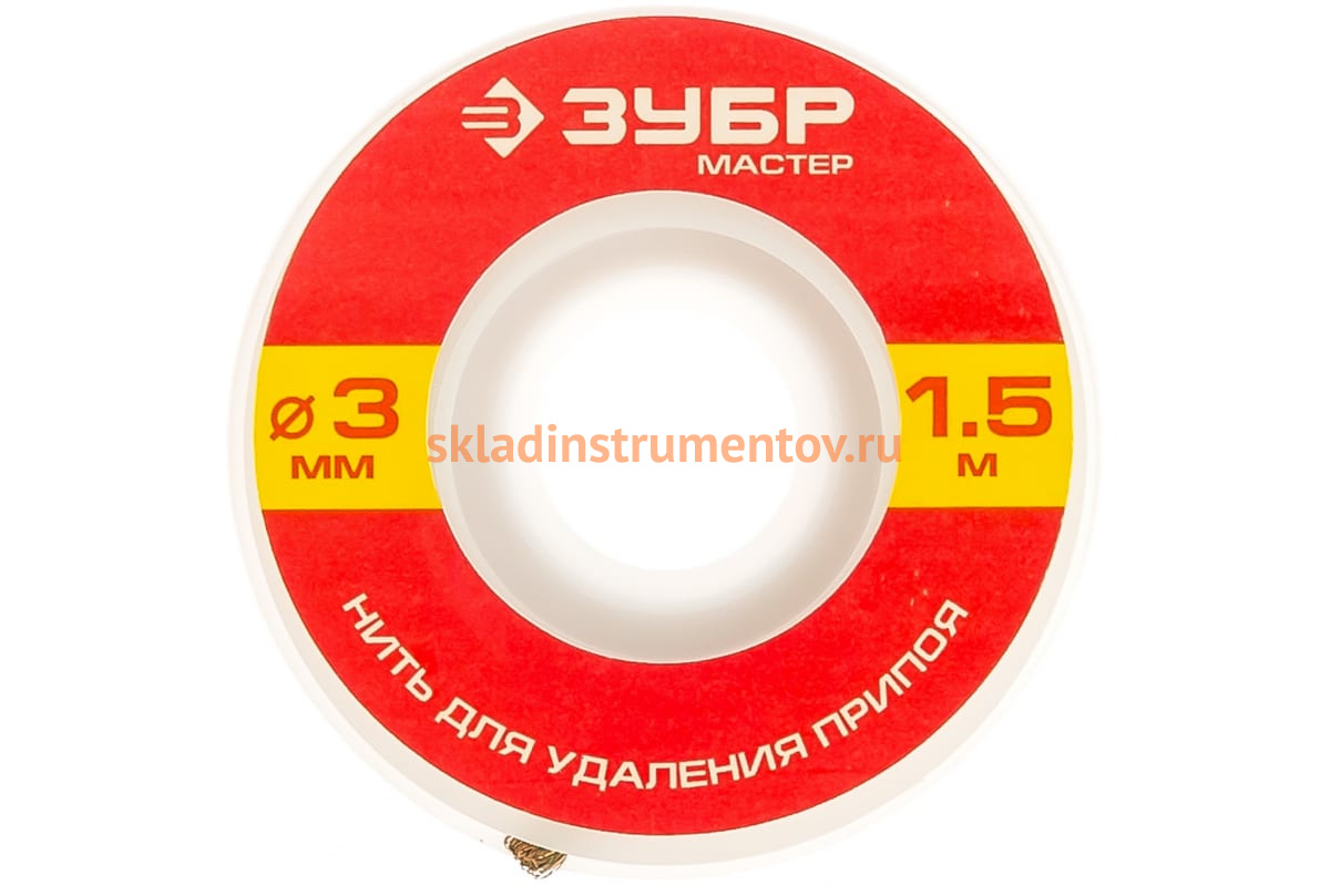 Нить МАСТЕР Зубр 55469-3 применяется для удаления излишков припоя в местах пайки контактов, радиодеталей и проводников. Представляет собой оплётку из тонкой медной проволоки, покрытую специальным флюсом. Длина — 1.5 м. Диаметр — 3 мм.