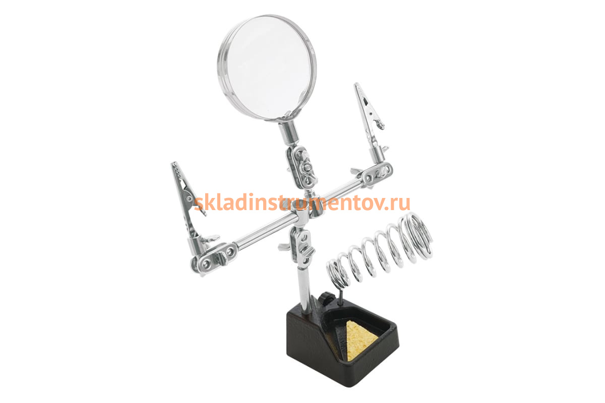 Штатив с лупой и держателем паяльника ProsKit 608-391E 00324021 применяется при паяльно-сборочных работах. Предназначен для зажима мелких деталей и плат. Оснастка оснащена поворачивающимися зажимами-держателями и линзой с 3-кратным увеличением.