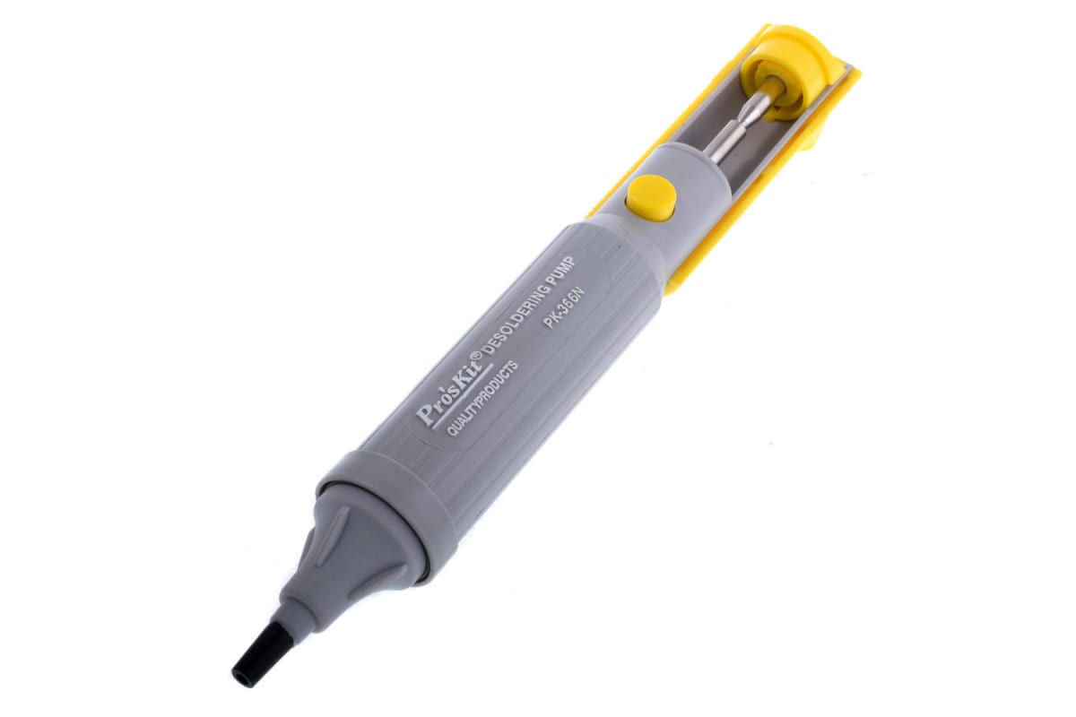 Отсос 8PK-366N-Y ProsKit 00160605 предназначен для удаления излишков или остатков припоя и флюса с печатных плат и электромонтажных элементов. Корпус изготовлен из полимерного ABS-пластика.