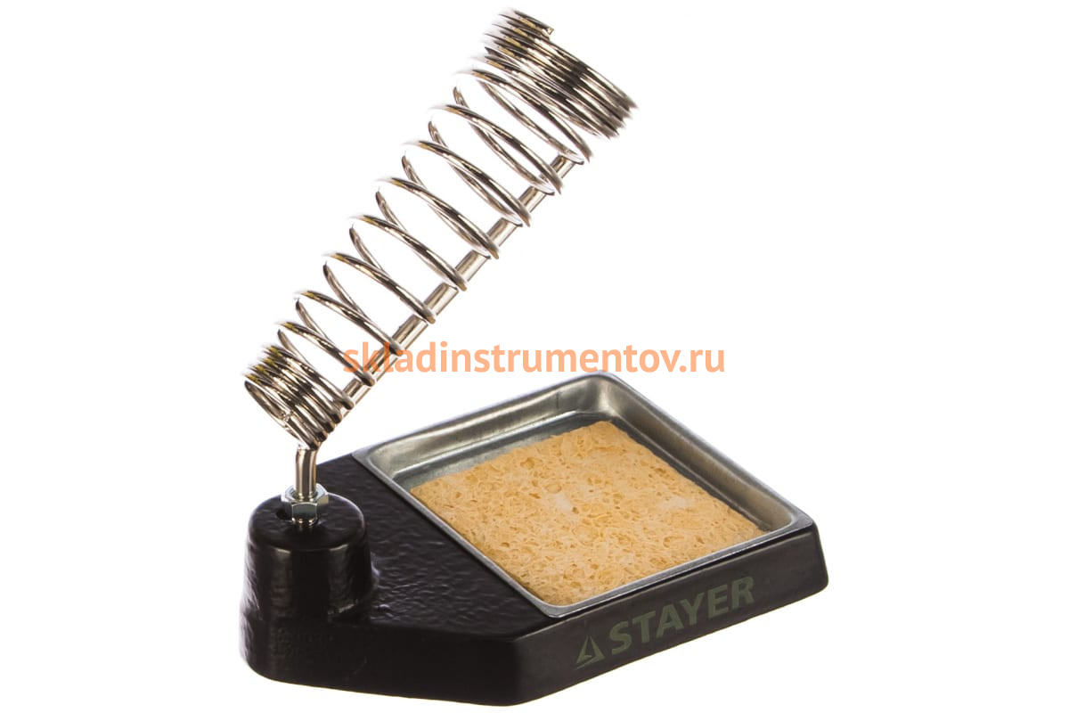 Подставка для паяльников "MASTER", литая Stayer 55319 обеспечивает безопасную работу с паяльником и для пользователя, и для рабочего места. Нагретый инструмент удерживается литым, поворотным держателем.