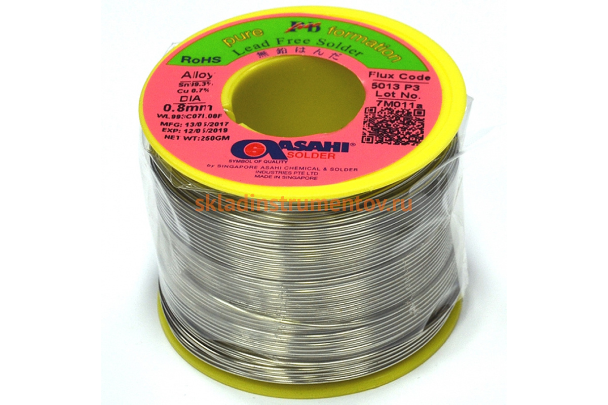 Припой (0.8 мм, 0.25 кг, Sn99,3/0,7Cu, 5013 флюс безотм., RMA бессв. припой) ASAHI 00-00000081 применяется для пайки и лужения при изготовлении радио- и электронной аппаратуры, печатных схем и приборов, изготавливаемых в соответствии с нормами RoHS (Pb free).