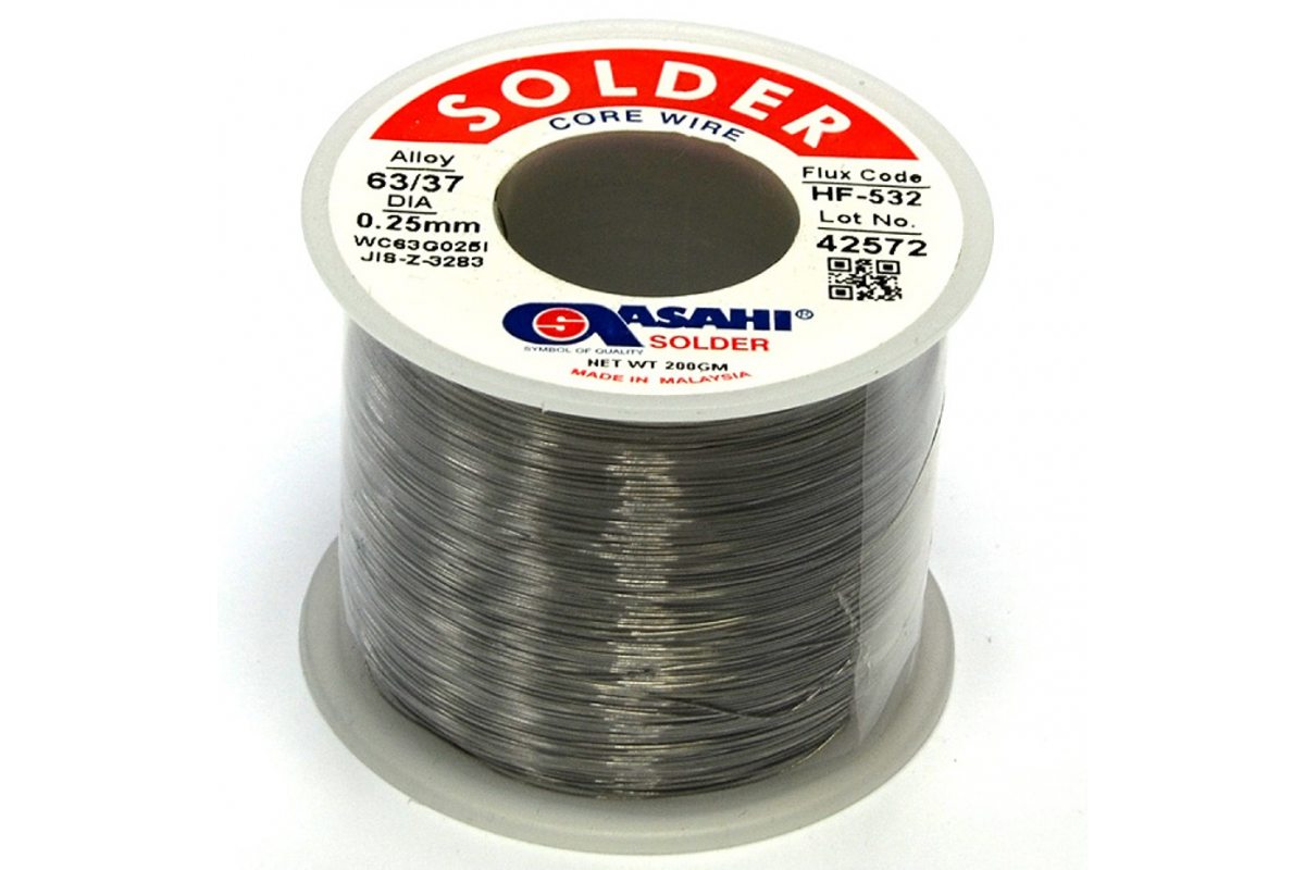 Припой (0.25 мм, 0.2 кг, Sn63/Pb37, HF532 флюс RMA) ASAHI 00-00002076 широко применяются для пайки и лужения в различных областях (радио- и электронная аппаратура, печатные схемы, приборы, обмотки электродвигателей, провода и кабели, радиаторы и пр.) Низкая температура плавления припоя позволяет использовать его в случаях, где недопустим перегрев паяемых деталей.