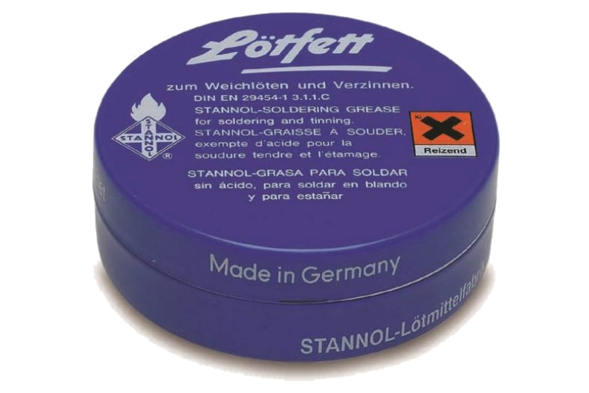 Жир паяльный CIMCO 15 0234 предназначен для мягкой пайки белой жести и освинцованной жести, лужения меди и латуни. Не подходит для электроники и электротехники (содержит хлорид цинка, едкий). Произведен согласно промышленному стандарту DIN 29454-1 3.1.1.C.