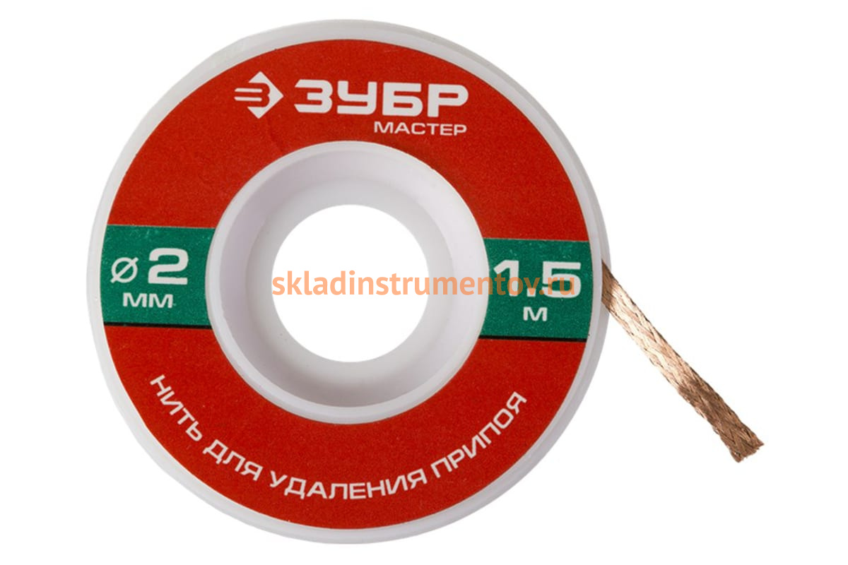 Нить МАСТЕР Зубр 55469-2 применяется для удаления излишков припоя в местах пайки контактов, радиодеталей и проводников. Представляет собой оплётку из тонкой медной проволоки покрытую специальным флюсом. Длина — 1.5 м. Диаметр — 2 мм.