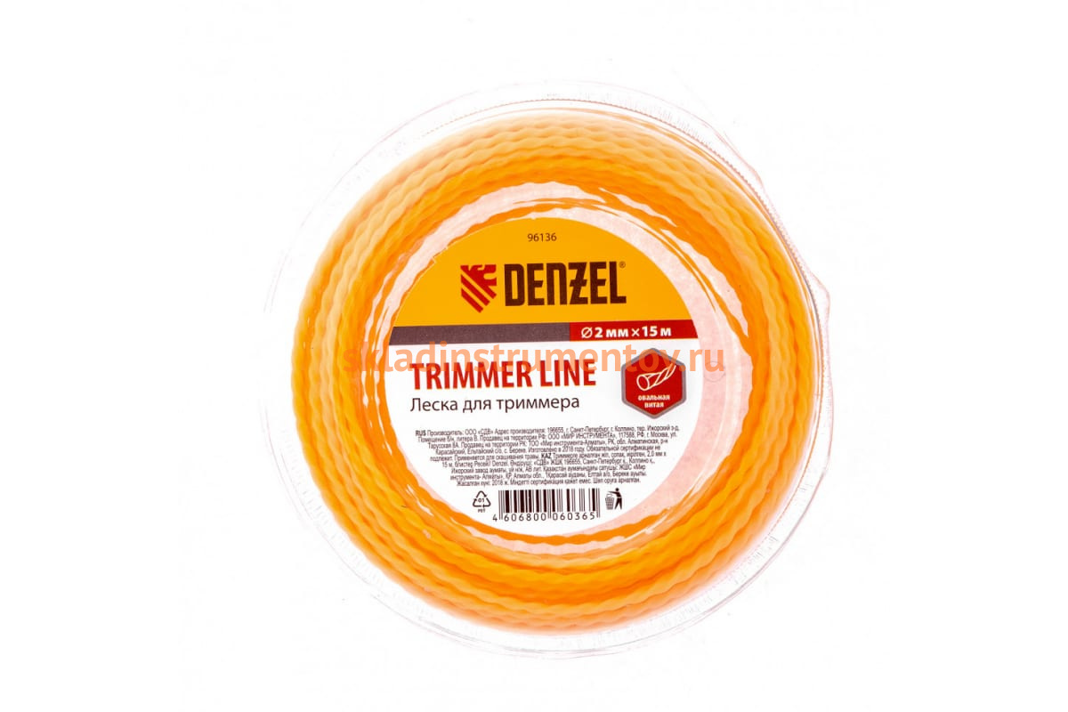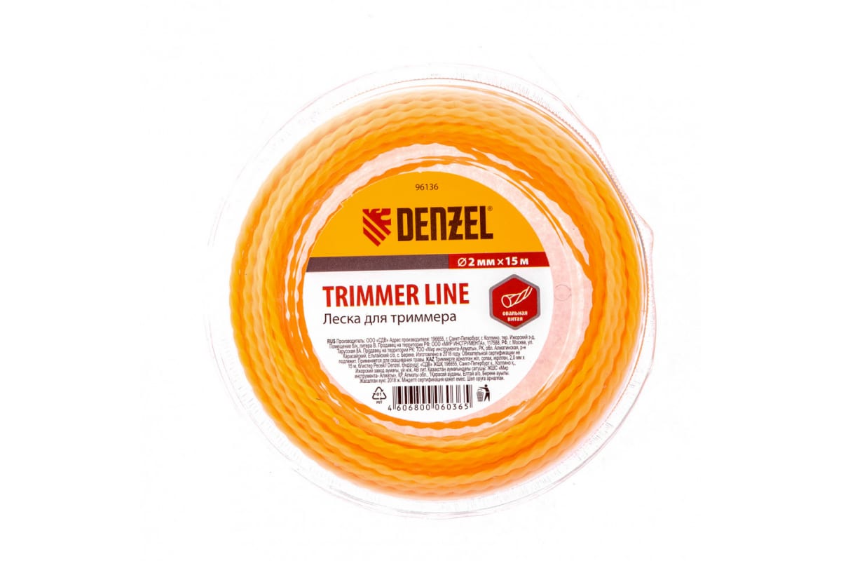 Леска для триммера овальная витая 2,0мм х 15м DENZEL 96136 Триммерная леска Denzel 2,0 мм х 15 м используется в качестве сменного режущего элемента для высокопроизводительных бензокос. Ее овальная витая форма диаметром 2 мм поможет справиться с густой травой, лопухами, борщевиком и зарослями кустарников.
