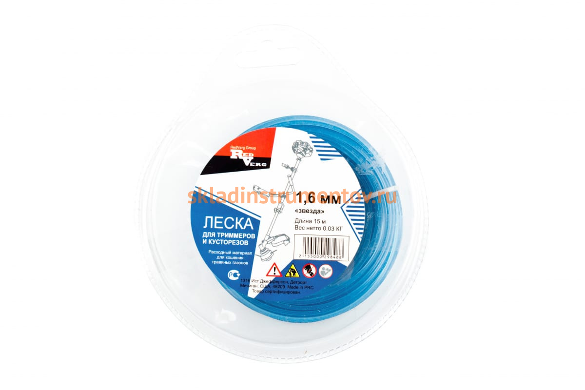 Леска для триммера 1,6 мм, 15 м, звездочка REDVERG 5014472 используется для ухода за газоном на садовых и придомовых участках.