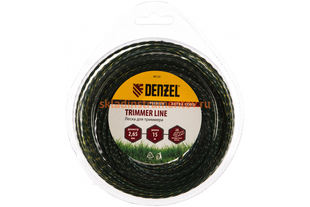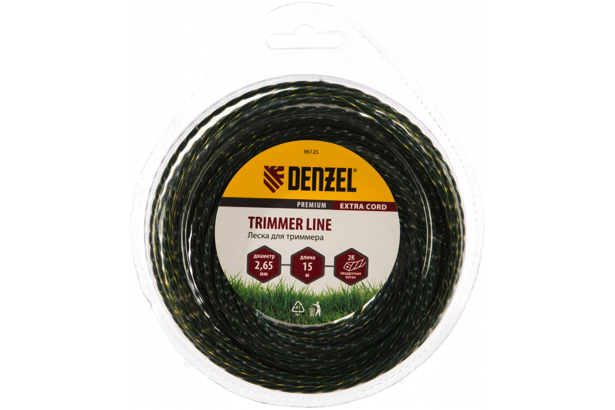 Двухкомпонентная леска для триммера квадрат 2,65 мм 15 м EXTRA CORD DENZEL 96125 подходит для высокопроизводительных безвизовых триммеров мощностью не менее 1500 Вт. Она имеет сечение в форме квадрата и ширину 2,65 мм, этого достаточно для скашивания газонной травы, сухостоя, небольших кустарников и высокого бурьяна.
