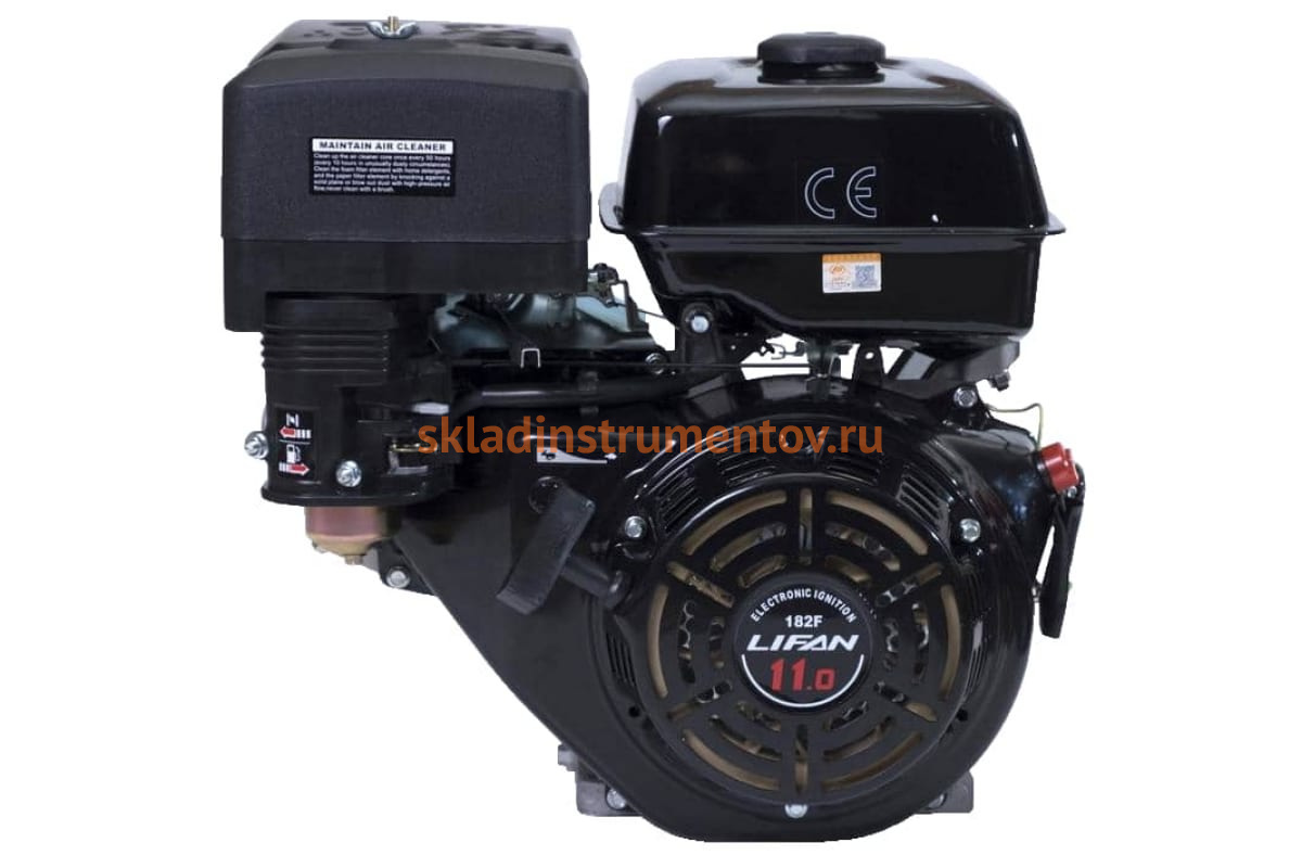 Двигатель 182F D25, 18А LIFAN 00-00000427 4х тактный, одноцилиндровый, OHV, с воздушным охлаждением. Подходит для установки на измельчители, минитракторы, мотоблоки, снегоуборщики, мотобуксировщики и вездеходы. Катушка освещения позволяет подключать двигатель к генератору.
