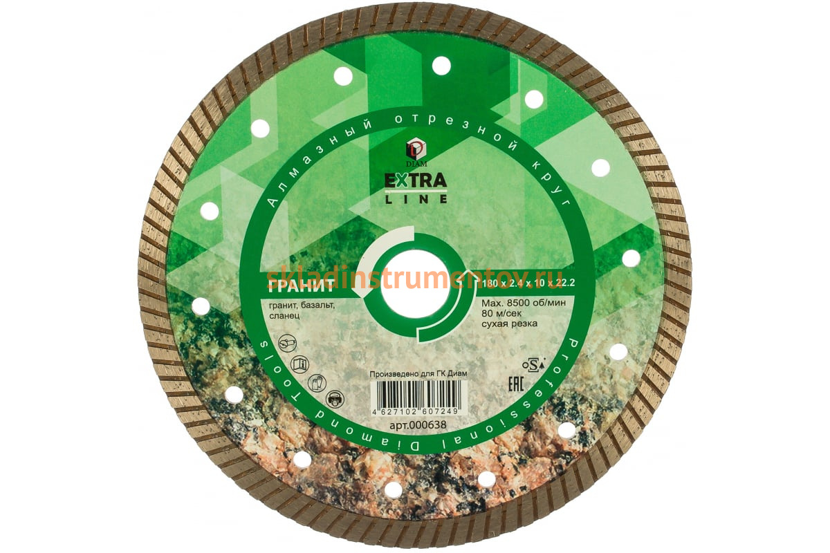 Круг алмазный отрезной Turbo Гранит Extra Line Diam 000631 предназначен для ручных резчиков. Применяется для сухого реза гранита, базальта, сланца и других твердых материалов. Круг имеет высокий ресурс и производительность. Высота алмазного слоя - 10 мм.