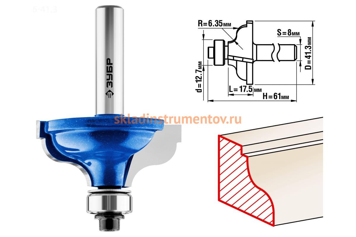 Фреза кромочная калевочная №5 ПРОФЕССИОНАЛ Зубр 28706-41.3 предназначена для фрезерных станков и ручных фрезеров. Применяется для скругления кромок при обработке столешниц, полок, шкафов и прочих работ с разнообразными видами древесины.