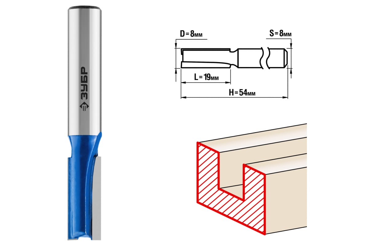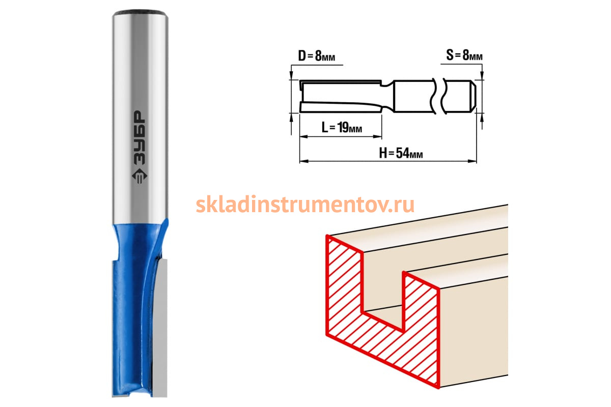 Фреза пазовая прямая ПРОФЕССИОНАЛ Зубр 28753-8-19 предназначена для фрезерных станков и ручных фрезеров. Применяется при обработке древесины. Подходит для изготовления пазов и канавок при обработке мебели, столярных изделий, предметов интерьера, а также реставрационных работах и внутренней отделке.