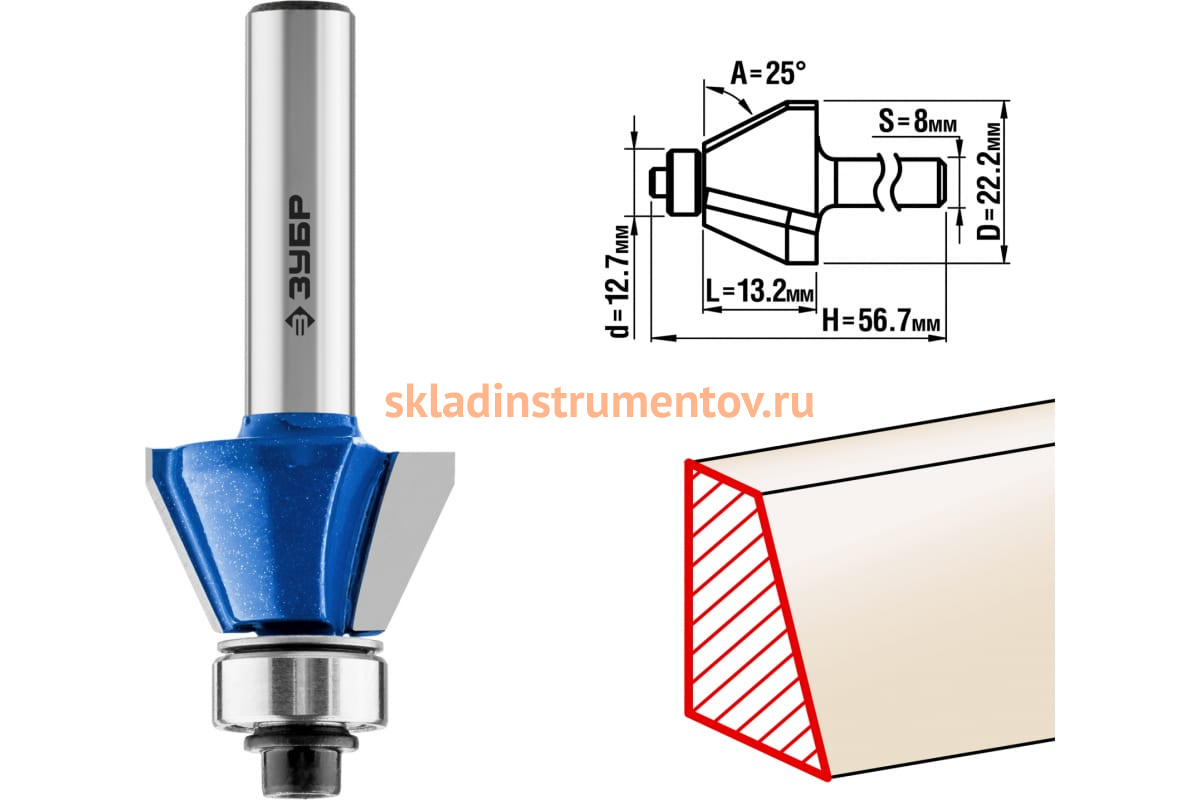 Фреза кромочная калевочная фасочная №9 ПРОФЕССИОНАЛ Зубр 28711-22.2 предназначена для фрезерных станков и ручных фрезеров. Применяется при обработке мебели, столярных изделий, предметов интерьера, а также реставрационных работах и внутренней отделке. Оснастка подходит для изготовления фаски с заданным углом на кромках деталей при работе с различными видами древесины. Диаметр подшипника – 12.7 мм.
