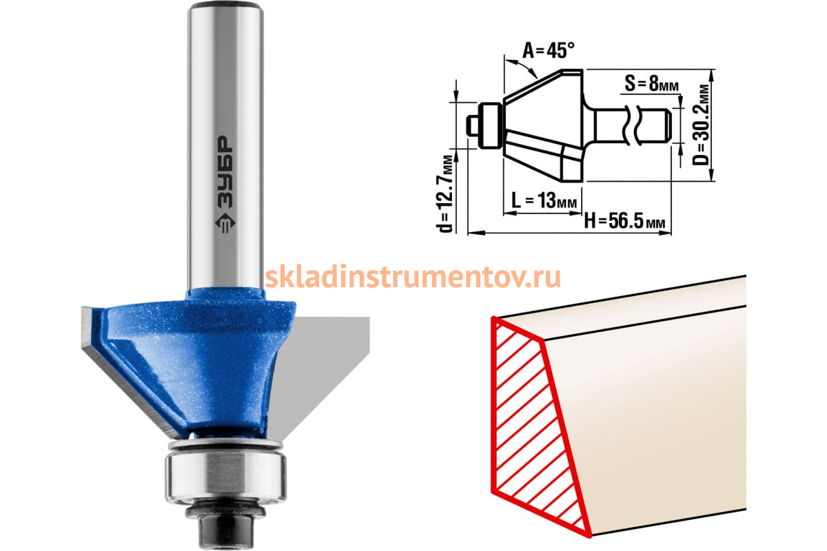 Фреза кромочная калевочная фасочная №9 ПРОФЕССИОНАЛ Зубр 28711-30.2 предназначена для фрезерных станков и ручных фрезеров. Применяется при обработке мебели, столярных изделий, предметов интерьера, а также реставрационных работах и внутренней отделке. Оснастка подходит для изготовления фаски с заданным углом на кромках деталей при работе с различными видами древесины. Диаметр подшипника – 12.7 мм.