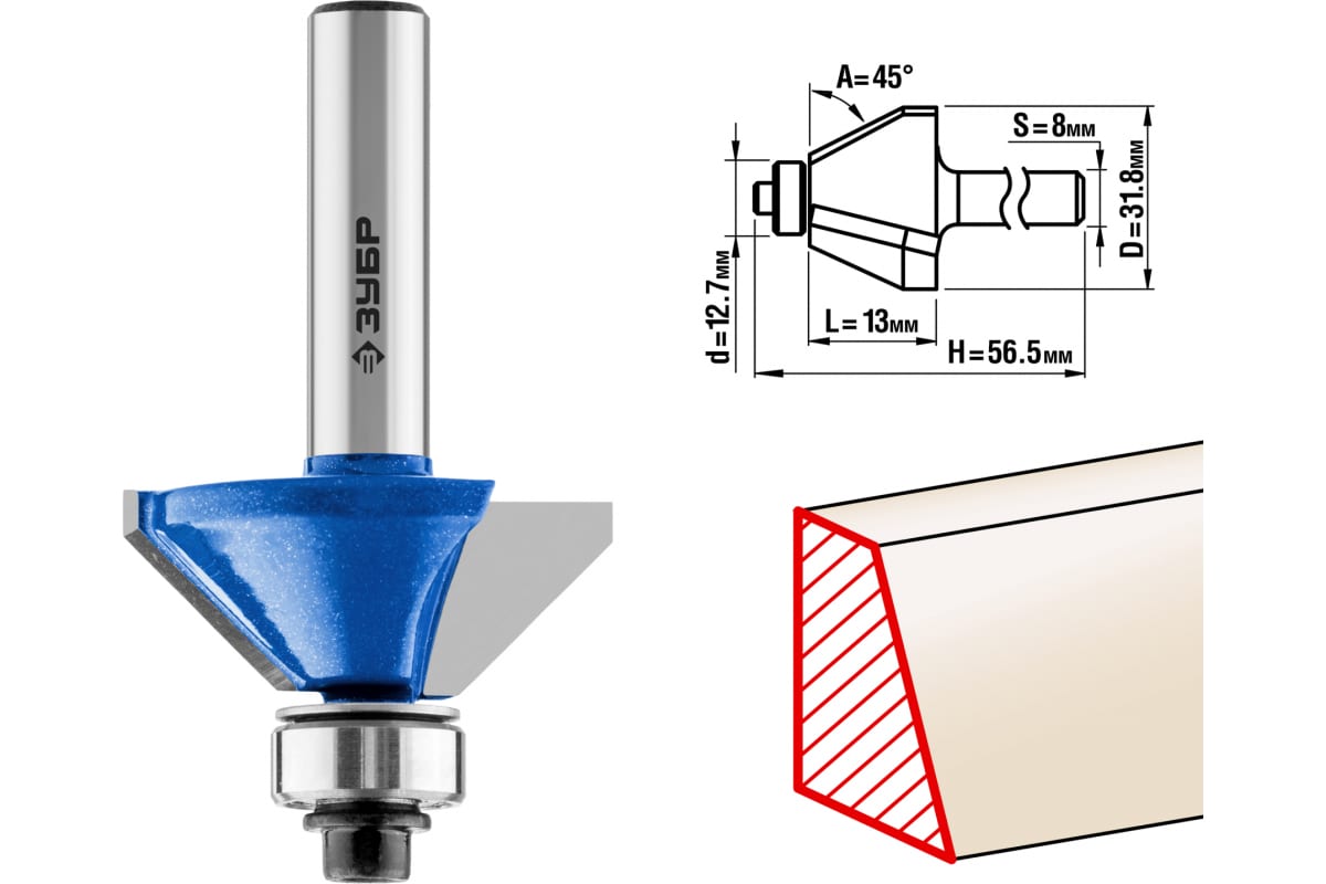 Фреза кромочная калевочная фасочная №9 ПРОФЕССИОНАЛ Зубр 28711-31.8 предназначена для фрезерных станков и ручных фрезеров. Применяется при обработке мебели, столярных изделий, предметов интерьера, а также реставрационных работах и внутренней отделке. Оснастка подходит для изготовления фаски с заданным углом на кромках деталей при работе с различными видами древесины. Диаметр подшипника – 12.7 мм.