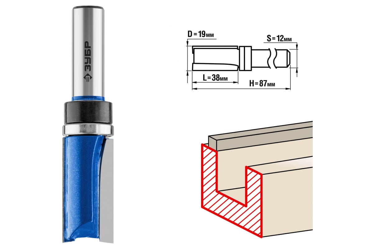 Фреза пазовая прямая с верхним подшипником ПРОФЕССИОНАЛ Зубр 28756-19-38-12 предназначена для ручных фрезеров и фрезерных станков. Применяется для обработки торцев, кромок и позволяет добиться их перпендикулярности с опорным столом при работе с различными видами древесины. Диаметр подшипника – 19 мм.