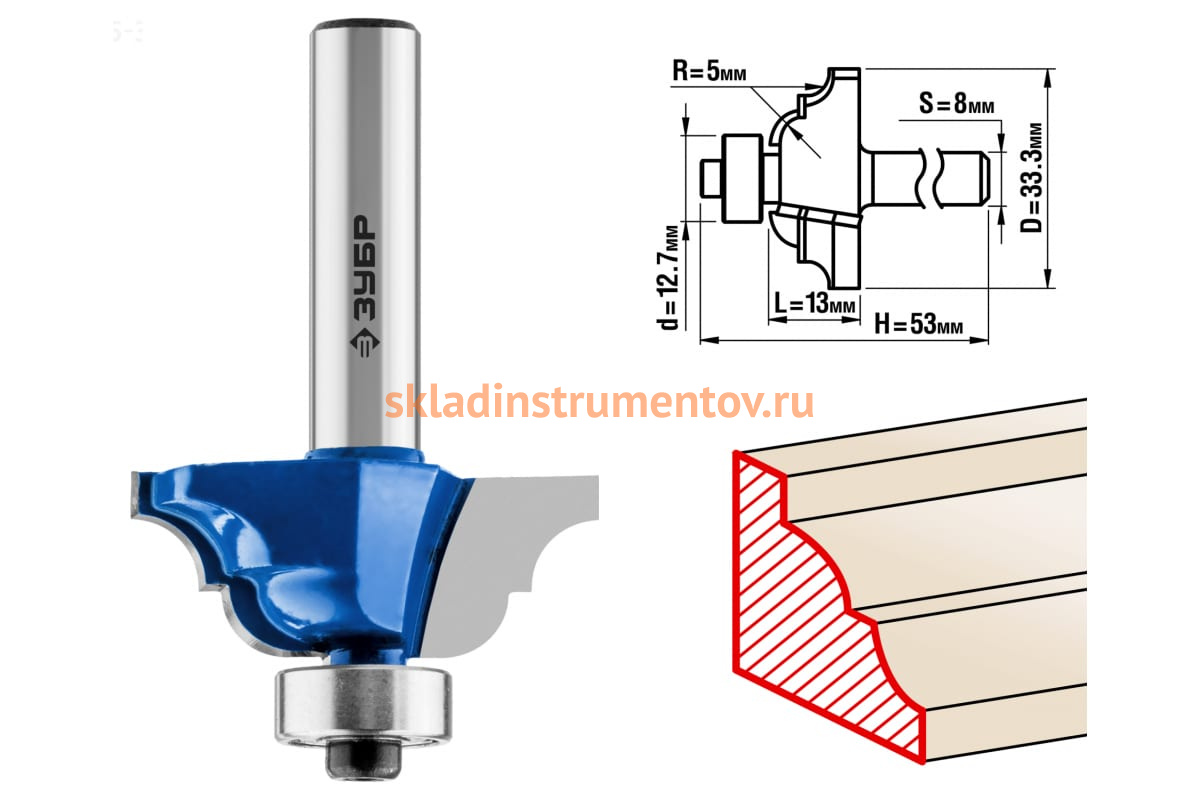 Фреза кромочная калевочная №4 ПРОФЕССИОНАЛ Зубр 28705-33.3 предназначена для фрезерных станков и ручных фрезеров. Применяется при обработке древесины. Фреза подходит для скругления кромок. Упорный подшипник 12.7 мм позволяет обрабатывать криволинейные кромки без дополнительных приспособлений.