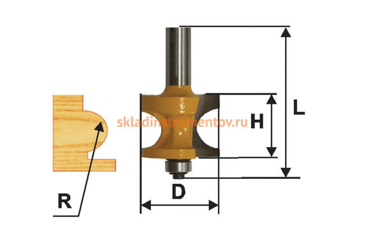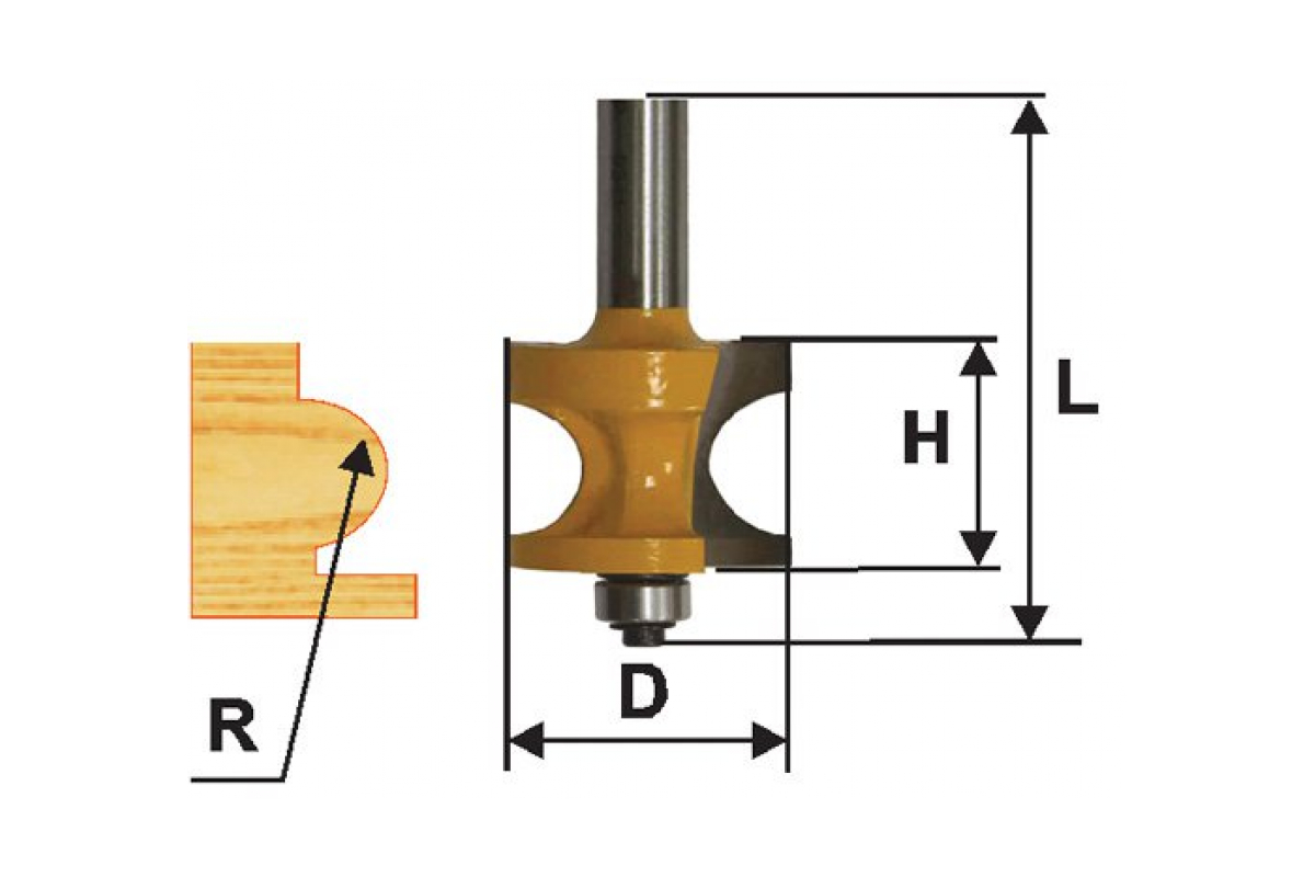 Фреза кромочная полустержневая (41.3 мм; R 12.7 мм; хв 12 мм) Энкор 46478 применяется для обработки столярных изделий, в том числе кромок столешниц, а также для изготовления профильных накладок, для получения сложного глубокого профиля и изготовления деревянных стержней.