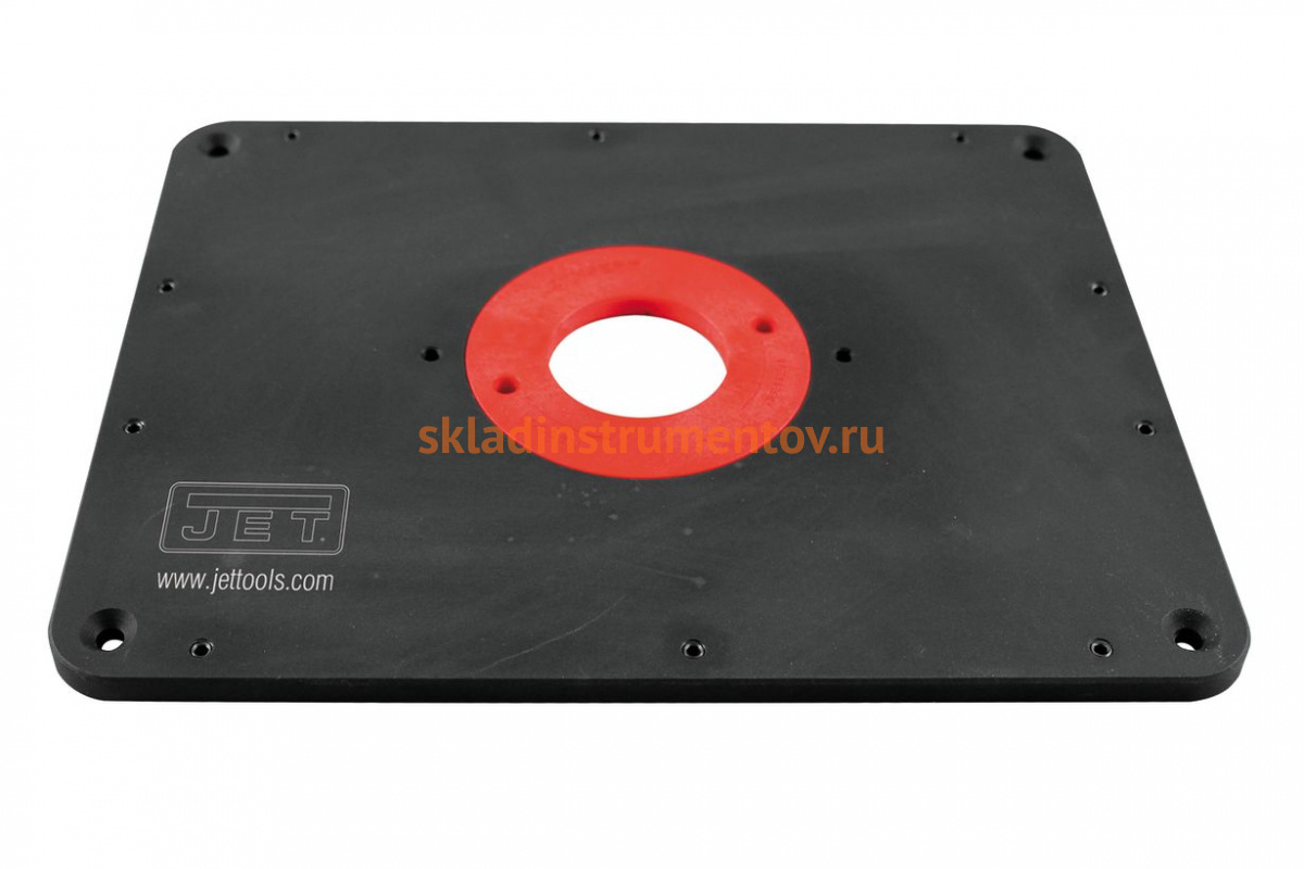 Пластина для крепления фрезера 298x235x10 мм JET 10000108 - дюралевая пластина для крепления фрезера и установки в отверстие универсального чугунного фрезерного стола Jet 98600W или другого подходящего. Может использоваться для фиксации любых моделей ручных фрезеров - крепежные отверстия сверлят с обратной стороны «по месту». Для облегчения монтажа пластина оборудована юстировочными винтами по периметру, предназначенными для выравнивания плоскости со столом станка.