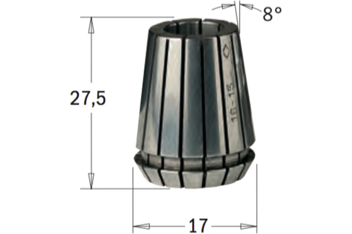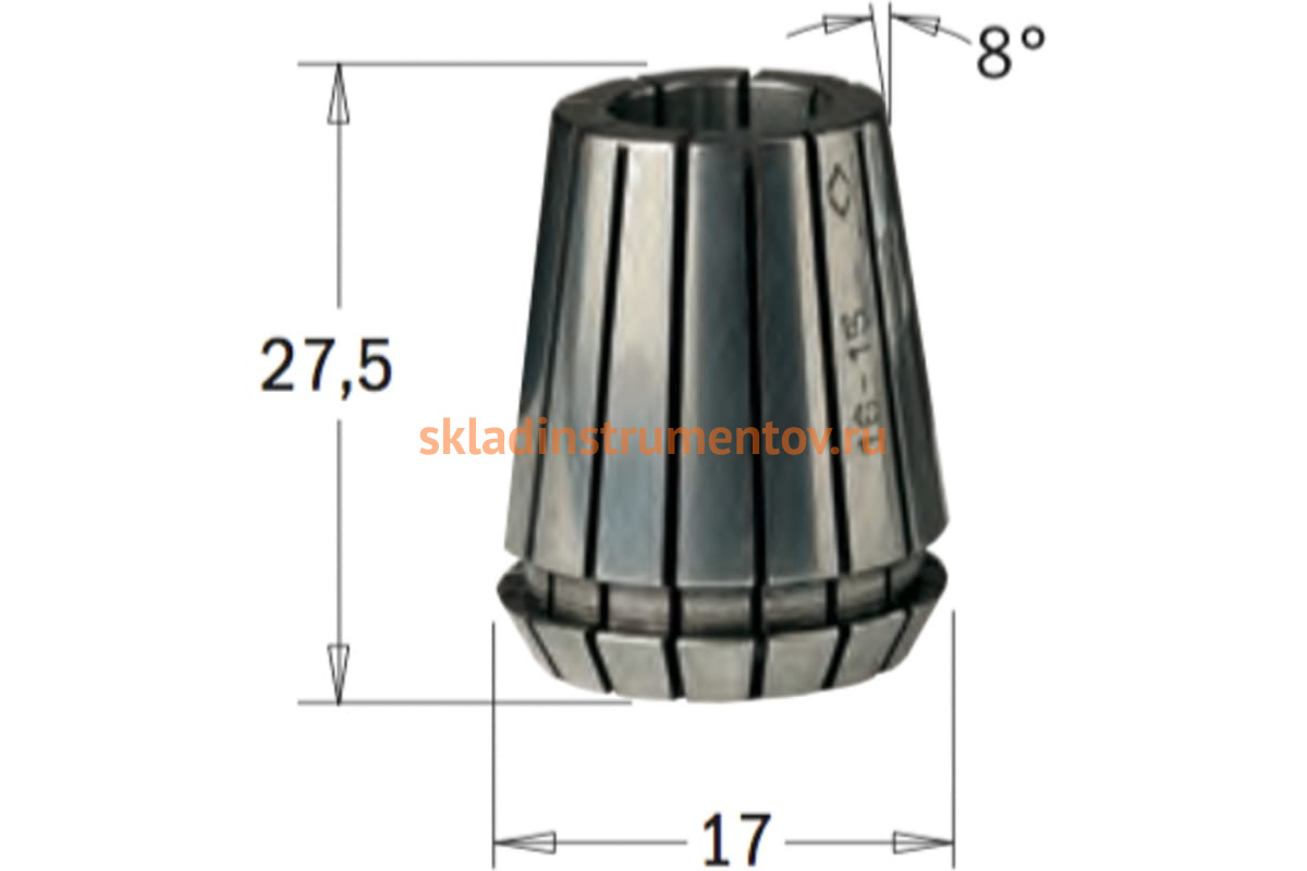Длина — 27.5 мм. Внешний диаметр — 17 мм. Внутренний диаметр — 4 мм. Угол конуса — 8°.