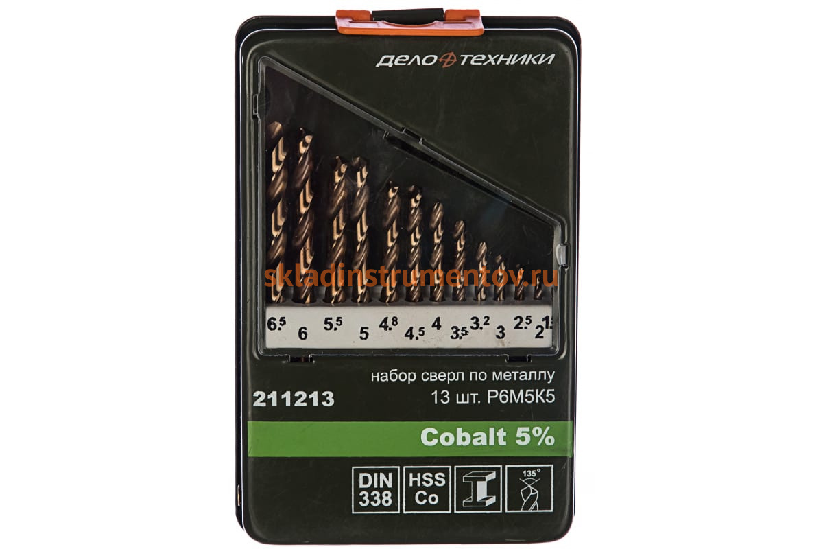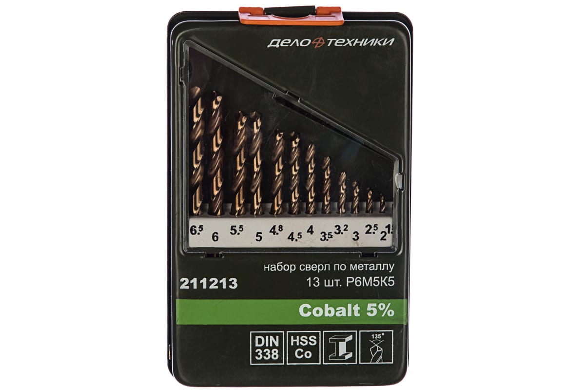 Набор свёрл Дело Техники 211213 предназначен для выполнения сквозных и глухих отверстий в легированной и нелегированной стали, сером чугуне, металлокерамическом сплаве на основе железа, ковком чугуне, цветном металле. Сверла изготовлены из быстрорежущей инструментальной стали с добавлением 5% кобальта для повышения термостойкости и износостойкости. Работают в правом направлении. Сверла поставляются в специальном боксе.