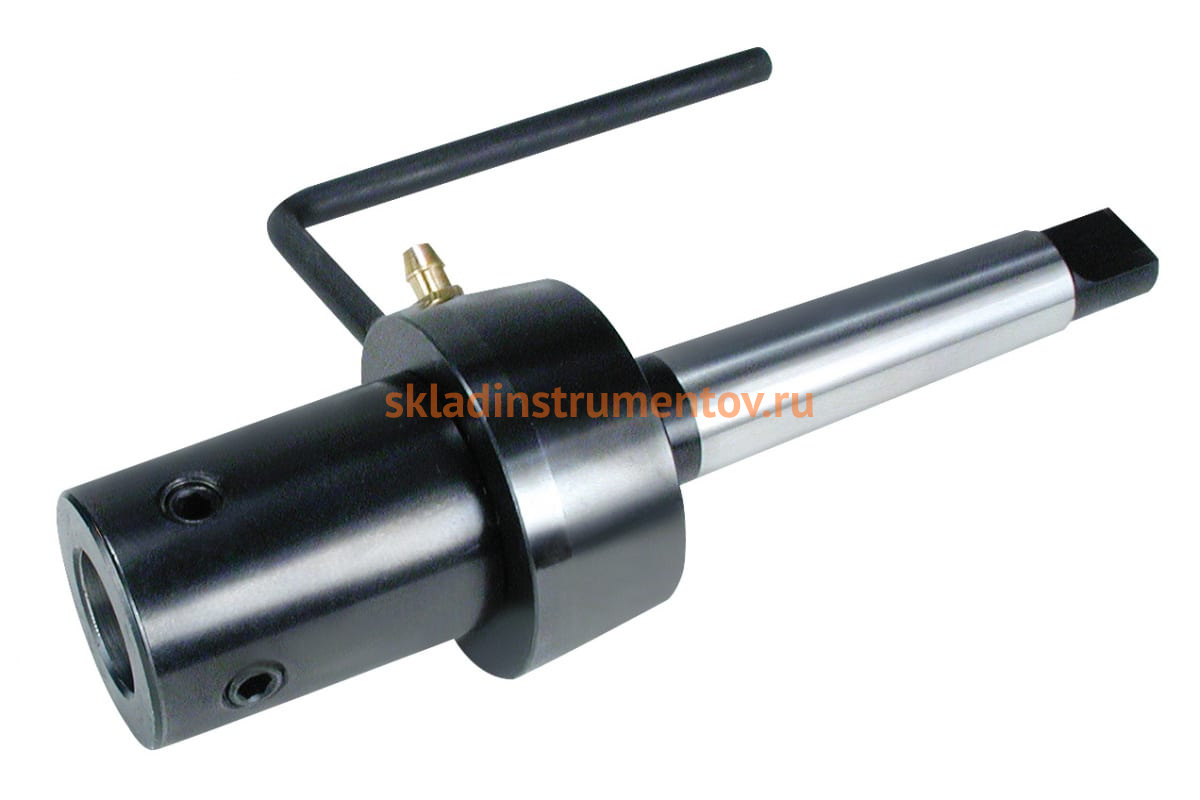 Переходник конусной МК3 RUKO 108303 предназначен для сверлильных станков. Применяется для установки режущего инструмента с хвостовиком Weldon 19. Оснастка крепится при помощи ключа. Имеет хвостовик с конусом морзе МК2. В комплекте поставляется бачок под охлаждающую жидкость и шланг для соединения. Патрон имеет патрубок для подачи СОЖ. Патрубок расположен на обойме, которая закреплена подвижно и не вращается при вращении патрона. Г-обраная штанга служит тормозом. Во внутренней части расположен подпружиненный клапан, который закрывает вытекание жидкости. При сверлении центрирующий штифт нажимает на этот клапан и обеспечивает поступление жидкости в зону сверления. Центрирующий штифт приобретается отдельно в зависимости от коронки, которой будет осуществляться сверление.
